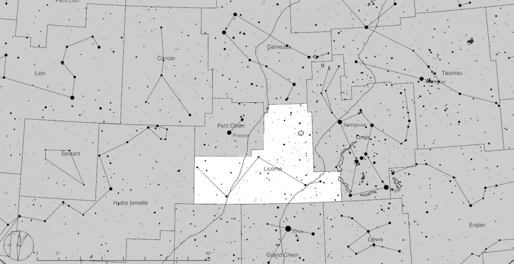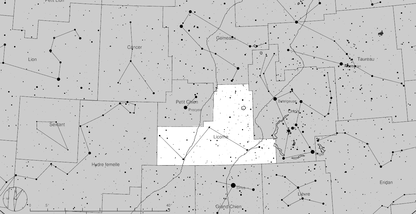 | NGC 2261 | LBN 920 | N | 06 39.2 | +08 45 | 2×1′ | Nébuleuse variable de Hubble. Détectable dans un petit instrument + UHC |