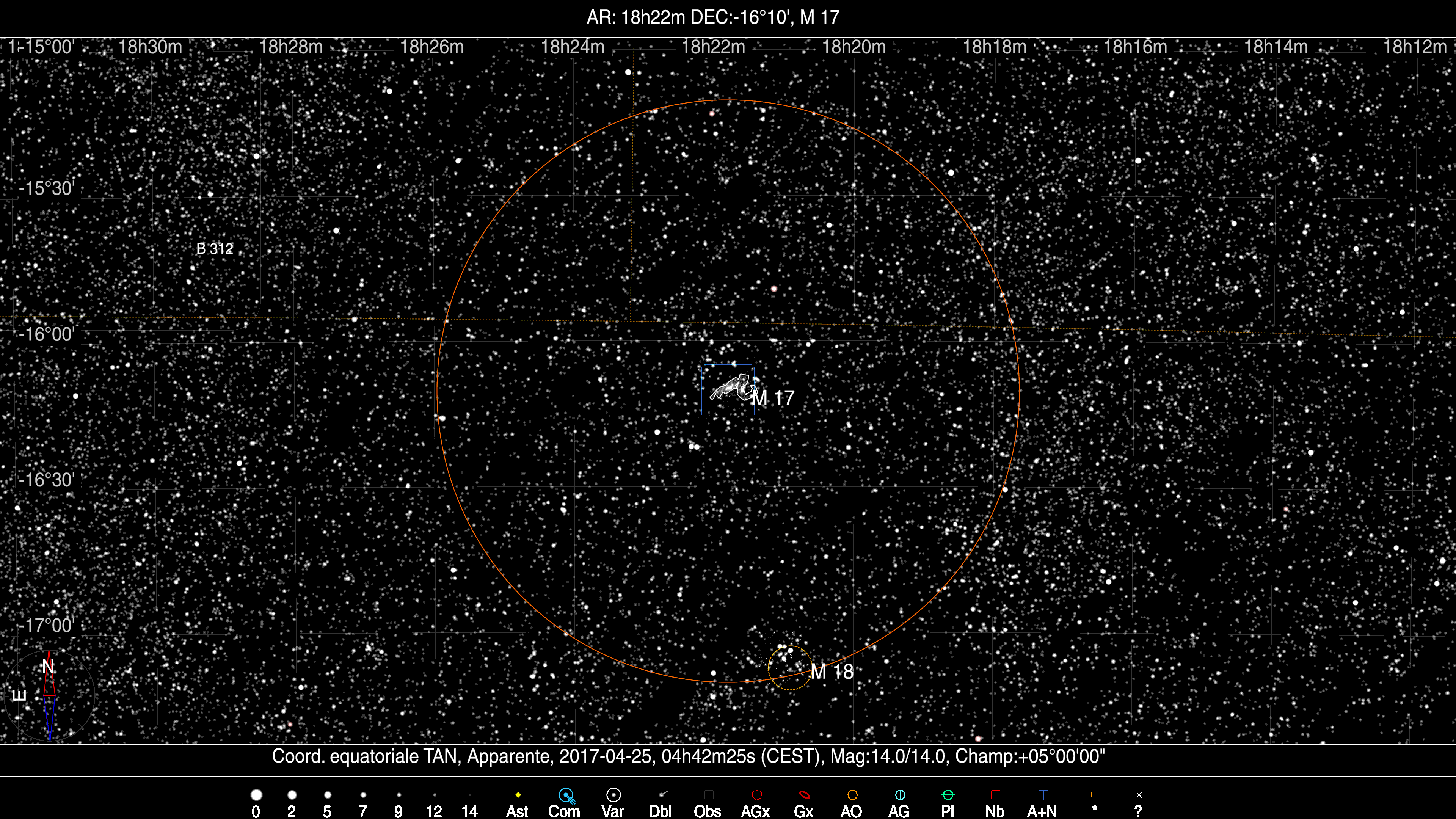 Facile à repérer aux jumelles, il suffit d’arpenter la Voie Lactée du Sagittaire, de passer d’une tache brillante à une autre en commençant par la plus brillante, la nébuleuse M8, de remonter sur l’autre nébuleuse M20, les amas M25 et M18, avant de tomber en arrêt sur M17 (avant de continuer à remonter sur M16). Fabuleuse nébuleuse qui se révélera d’autant plus que l’on utilisera un filtre UHC, apte à faire ressortir au mieux ses régions HII. Elle est par ailleurs située à 2 ° SO de l’étoile Gamma de l’Écu de Sobieski (Gam Scu)