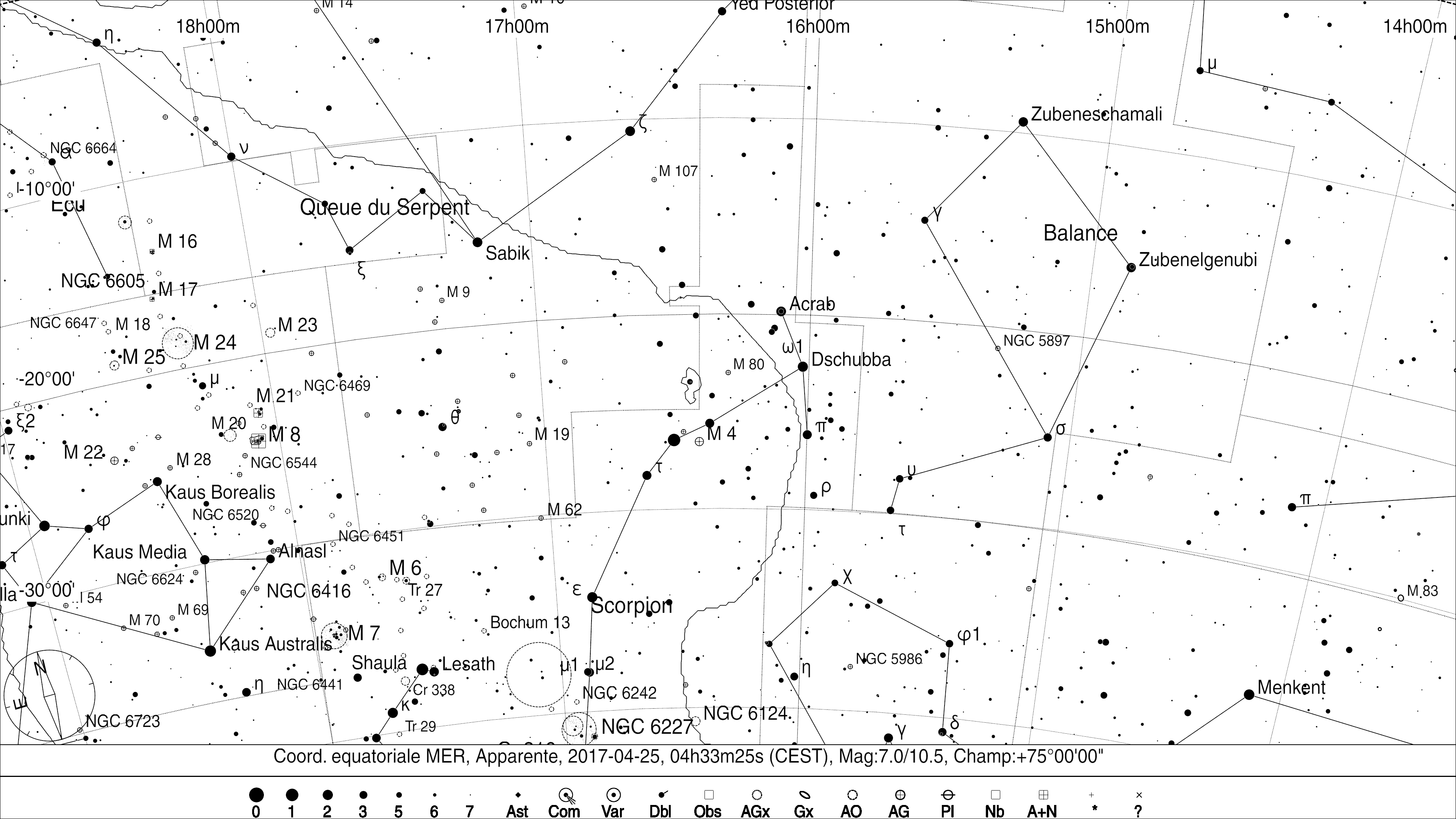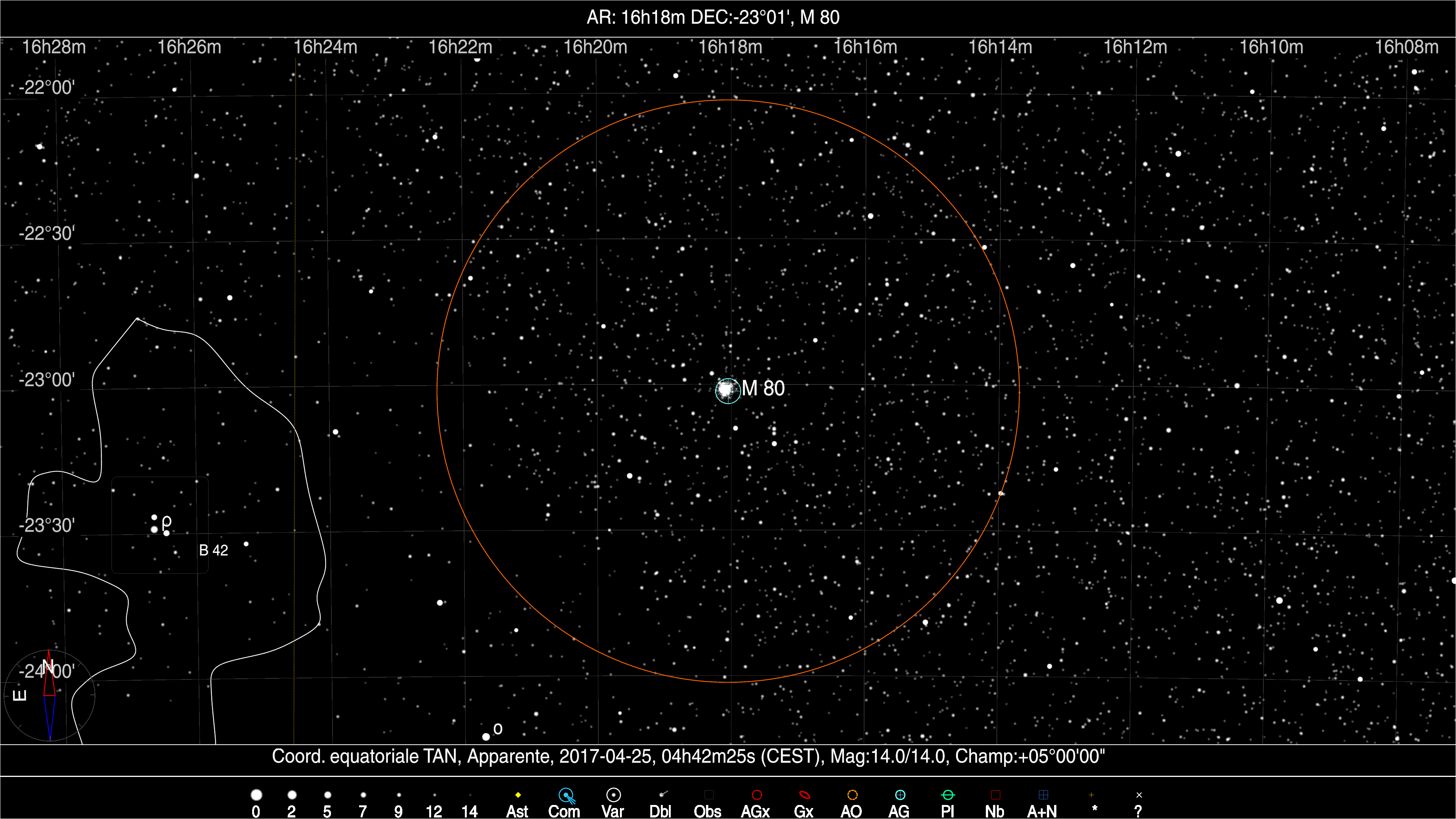 Distant d’environ 27000 années lumière, M80 est l’un des amas les plus denses de notre galaxie, pour un diamètre estimé à 96 al. Âgé de 12,5 milliards d’années, l’amas contient plus de 200000 étoiles. Il fut également le théâtre d’une nova en 1860, cette dernière atteignant la magnitude de +6,8.