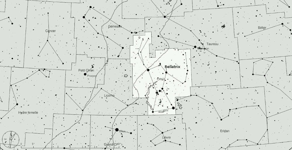 Infos : Bellatrix (γ Orionis / γ Ori) est une étoile géante bleue, la troisième plus brillante étoile de la constellation d’Orion. Agée de 20 millions d’années, il lui reste environ 7 millions d’années à vivre dans la séquence principale (transformation de l’hydrogène en hélium) avant de connaître une accélération dramatique de son évolution, soit en supernova (sa masse actuelle de 9 masses solaires est la masse critique limite pour une telle évolution), soit en naine blanche massive.