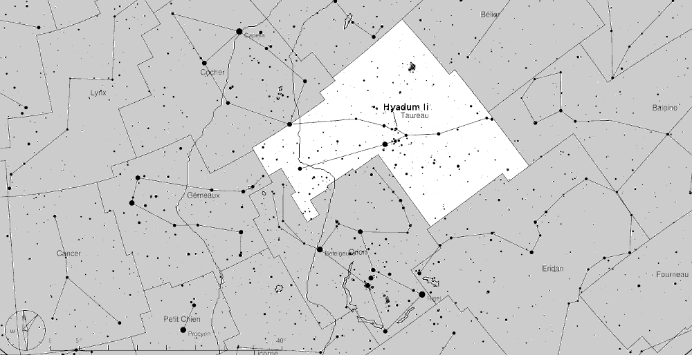 Infos : Delta1 Tauri est la treizième étoile la plus brillante de la constellation du Taureau. Il s’agit d’une étoile triple située à 155 années lumière. La composante principale Del1 Tau A est une géante de type spectral K0-III, 74 fois plus lumineuse, 11,6 fois plus large et 2,6 fois plus massive que le Soleil. Del1 Tau B se trouve à 107 secondes d’arc, mais il s’agirait d’un compagnon optique. Par contre une occultation lunaire a permis de suspecter la présence d’un compagnon de magnitude +12 bien plus proche (1,76 unité astronomique) et lié physiquement.
