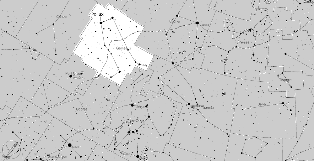 Voisinage : Alpha Gémeaux (Castor), Iota Gémeaux (Propus), Delta Gémeaux (Wasat)