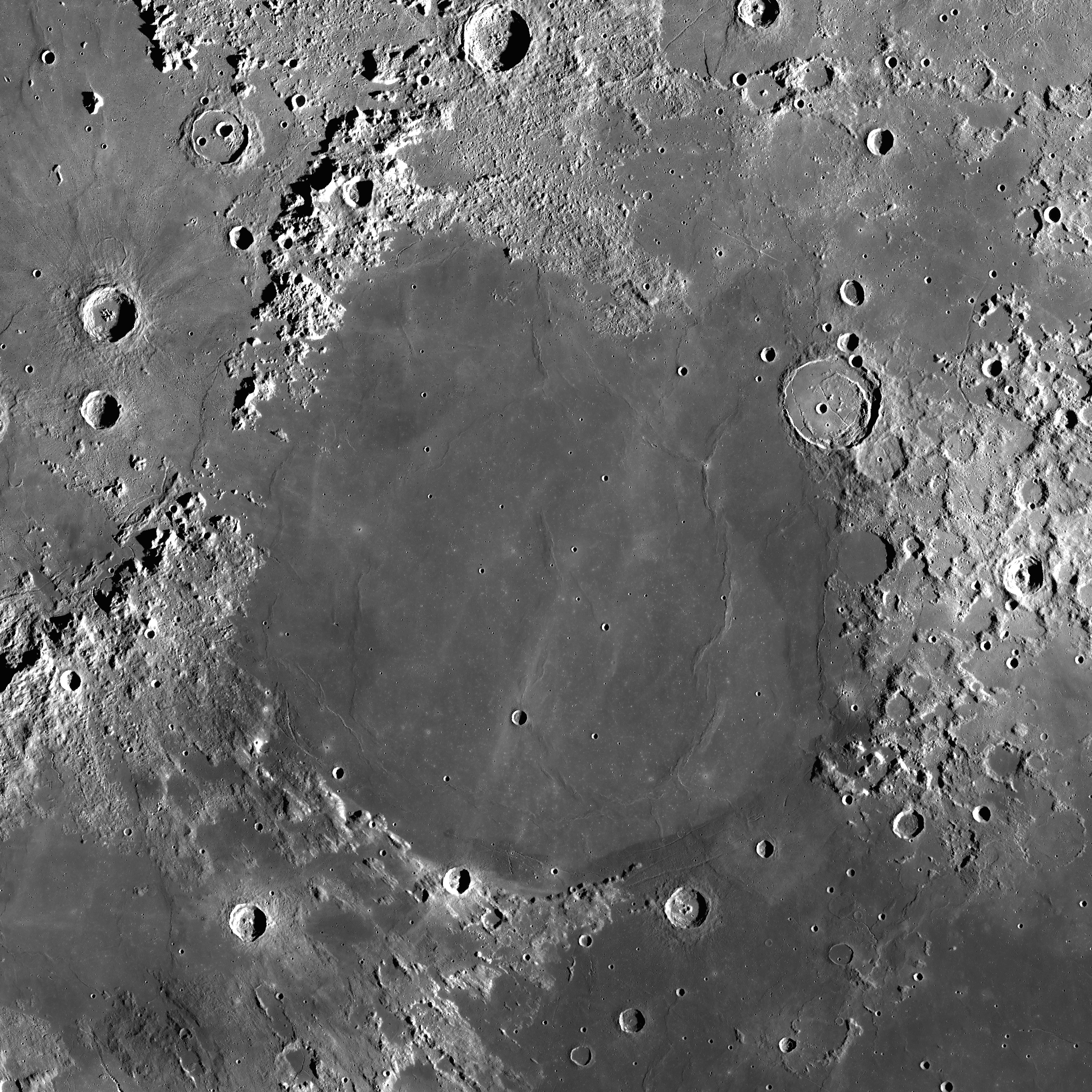 Fond plat rempli de lave avec Gärtner D au Sud et Rima Gärtner à l’Est. Monticules et craterlets.