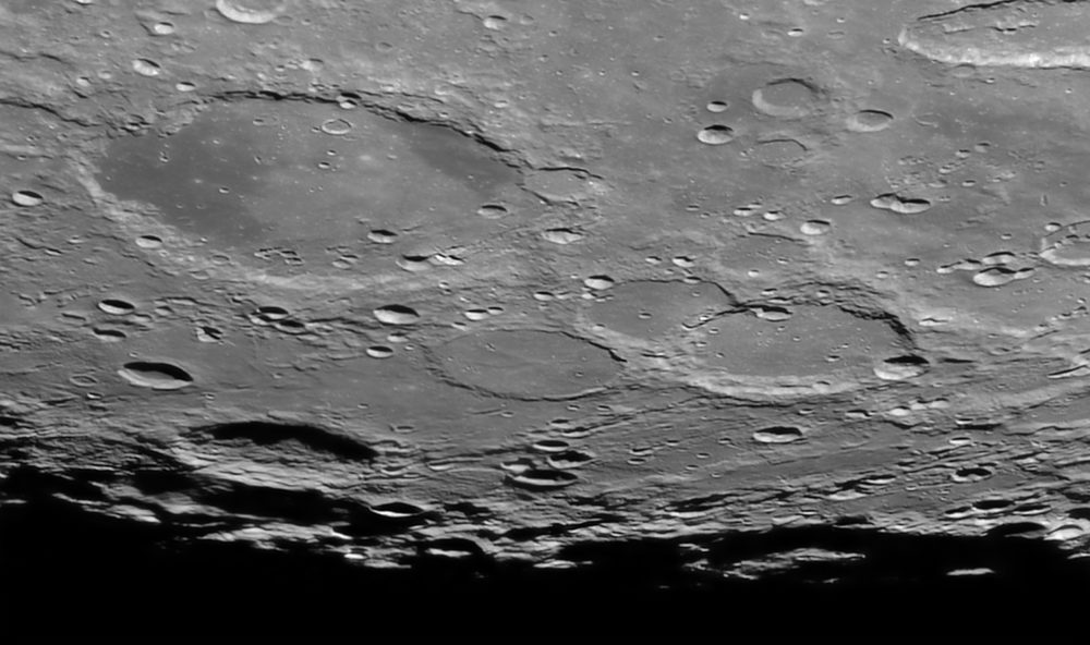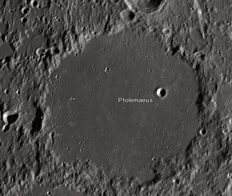 – le cratère PTOLEMEE. Diamètre : 154km. Profondeur : 2 400m. Proche du centre de la Lune et situé au nord de la Mer des Nuées, il est moins sombre que le cratère PLATON. Il est associé à 2 autres cratères : ARZRACHEL et ALPHONSE.