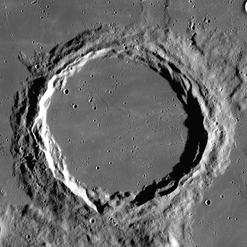 Diamètre : 83km. Profondeur : 2 150m. Ses versants en gradins lui confèrent une similitude avec le cratère COPERNIC.