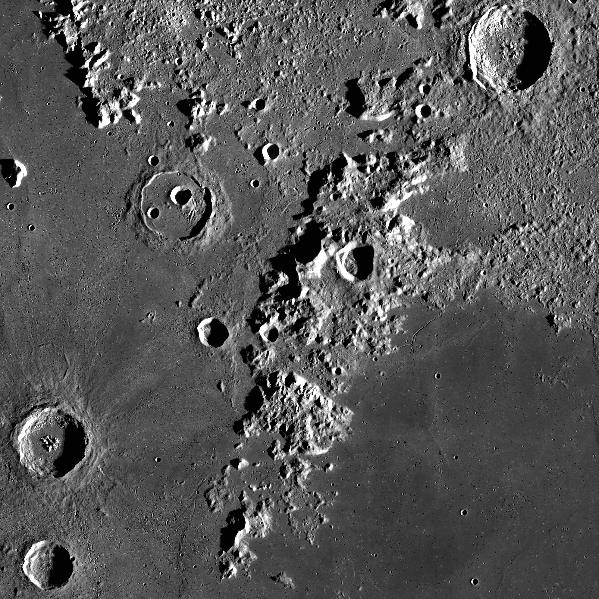 Les monts Apennins (401km de long) et les monts du Caucase plus au nord (520km) séparent la Mer des Pluies de la Mer de la Sérénité avec des sommets jusqu’à 6 000m.