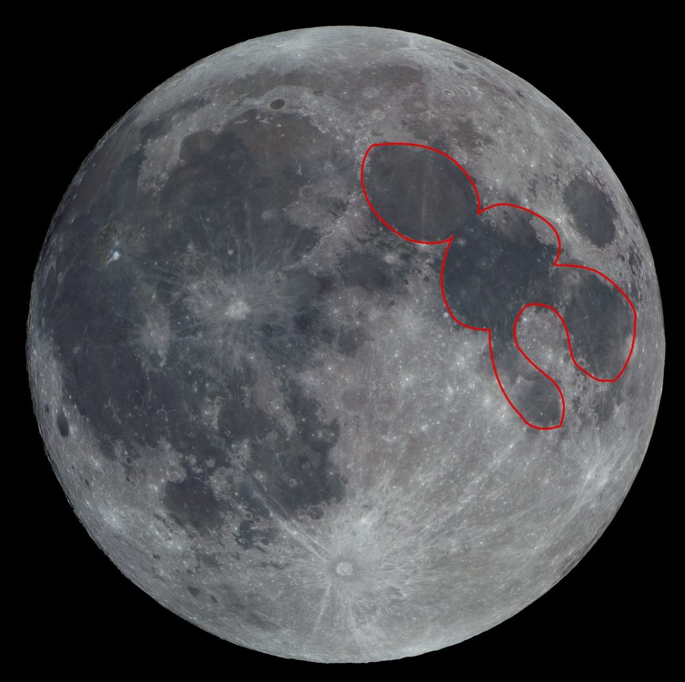 Océan des tempêtes à gauche (NASA (mosaique d’ images par LRO), domaine public)