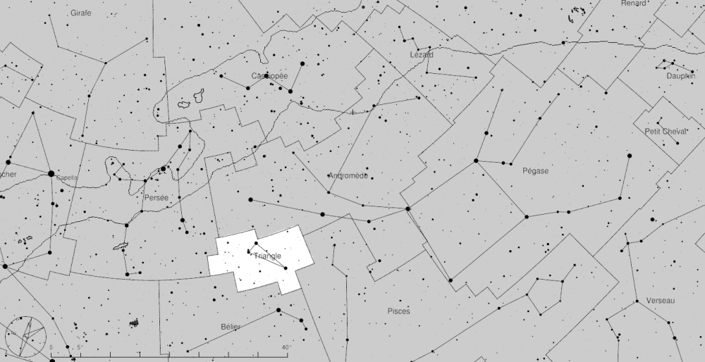 | NGC 598 | M 33 | GLX | 01 33.9 | +30 39 | 5,7 | 14,2 | 68.7x41.6′ | Galaxie du triangle. Grand champ, faible grossissement |