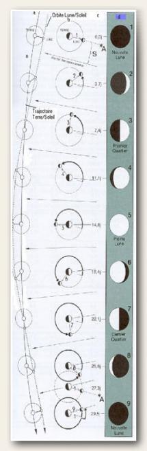 La période de révolution sidérale est de 27,32 jours. C’est le temps nécessaire pour que la Lune se retrouve dans la même position par rapport aux étoiles. La période de révolution synodique est de 29j 12h 49mn 30s. C’est le temps nécessaire pour que la Lune retrouve la même position par rapport au Soleil, c’est à dire entre 2 phases strictement identiques. La différence entre les deux périodes est due à la rotation de la Terre autour du Soleil. |