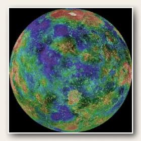 La taille et la masse de Vénus sont presque semblables à celles de la Terre, et sa structure interne est similaire, avec un cœur en nickel et en fer. La chaleur qui y règne est insupportable, et la planète est recouverte d’épaisses couches de gaz suffocantes. Son atmosphère dense, où domine le gaz carbonique qui en constitue désormais 96%, accompagné d’un peu d’azote et d’autres gaz à l’état de traces, est due à d’énormes volcans, peut-être encore en activités.