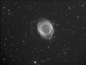 Helix nebula, la nébuleuse de l’hélice, dans le Verseau. 16 poses de 3 minutes en Ha (48 minutes au total), télescope de 200mm à F/D=4, monture skywatcher neq6, caméra ZWO 1600MMC Pro, roue à filtre et autoguidage Starlight Xpress, le tout en remote (Raspberry Pi 3, connexion wifi, ordi portable à l’abri), logiciel d’acquisition Kstars en mode planification. Traitement Siril avec le script automatique, retouches avec GIMP 2.9.