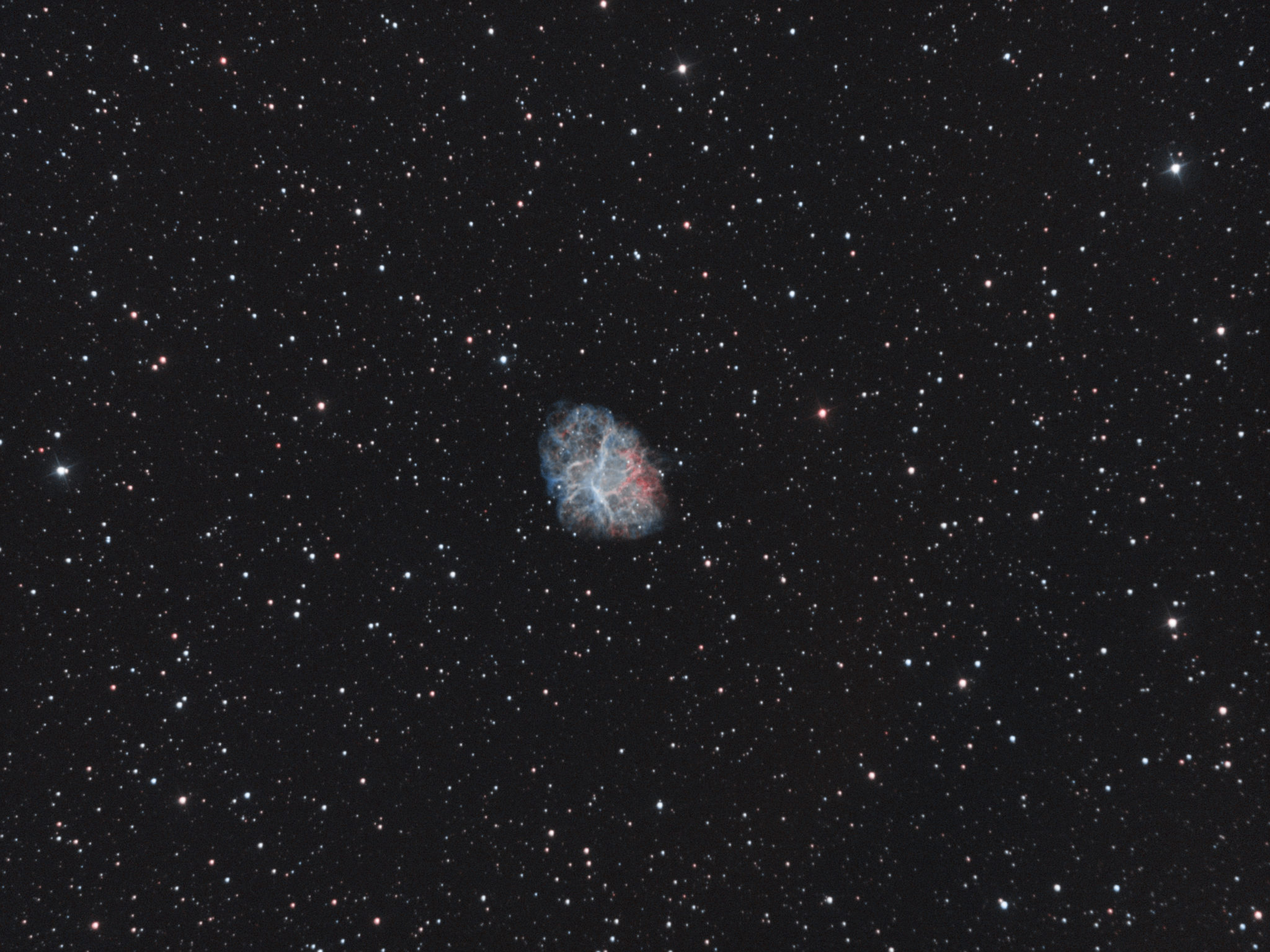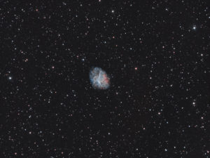 J’ai retraité M1 pour la …, je ne sais plus combien de fois, voici la dernière version, traité en HOO. Ce qui m’ennuie dans mes images quand je fais du Ha, c’est le halo rouge sur les étoiles les plus brillantes. Je ne sais pour quelle raison.