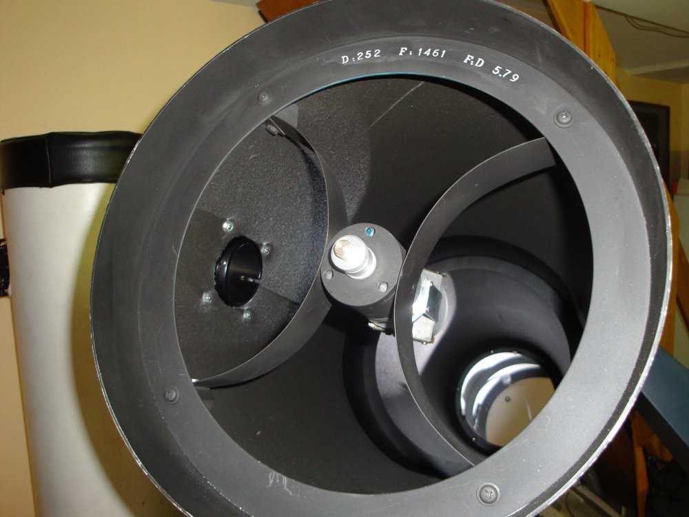 Diamètre du miroir primaire : 252 mm Lambda : 1/22 par la méthode de Foucault Focale : 1461 mm Type(s) de monture : Équatoriale à fourche Araignée courbe Porte oculaire à cabestan Entrainement AD moteur pas à pas, Dec moteur continu