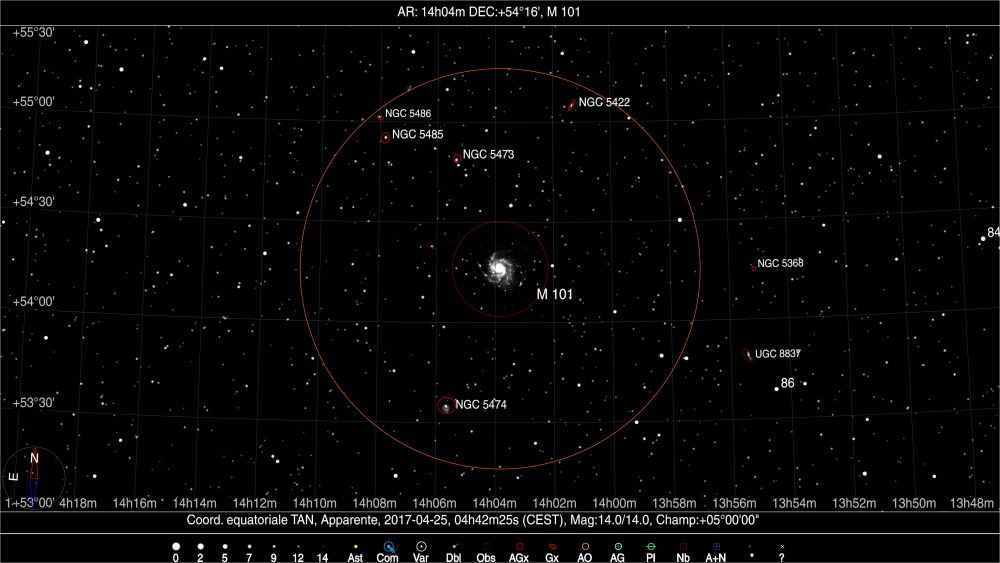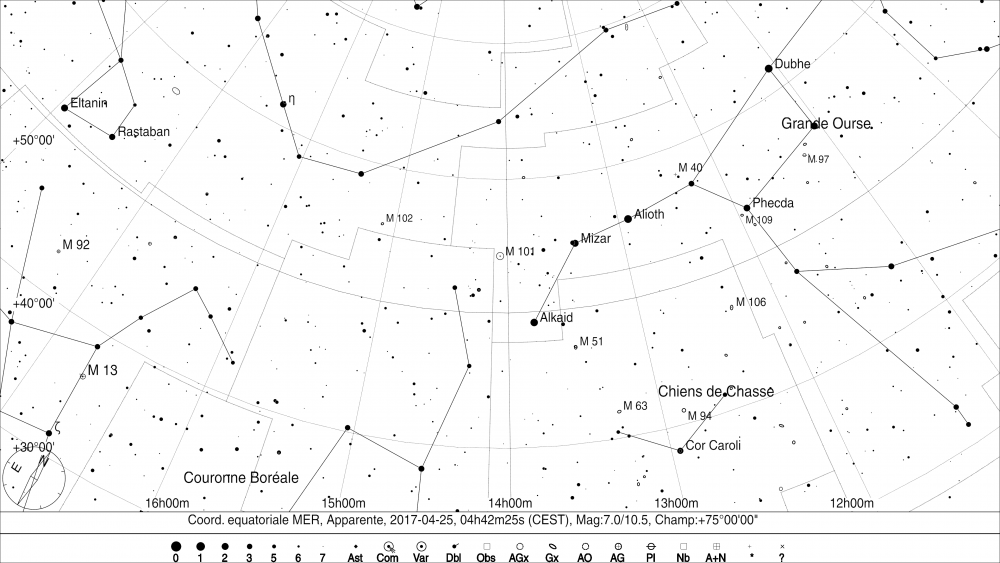 Si elle nécessite d’excellentes conditions de ciel pour être observée, Messier 101 est par contre facile à repérer, formant la pointe d’un triangle avec les étoiles de la queue de la Grande Ourse, Alkaid et Mizar. Galaxie spirale très étendue, vue par le dessus, elle est accessible aux jumelles. Privilégier de faibles grossissements. Un bon test pour mesurer la qualité de votre ciel …