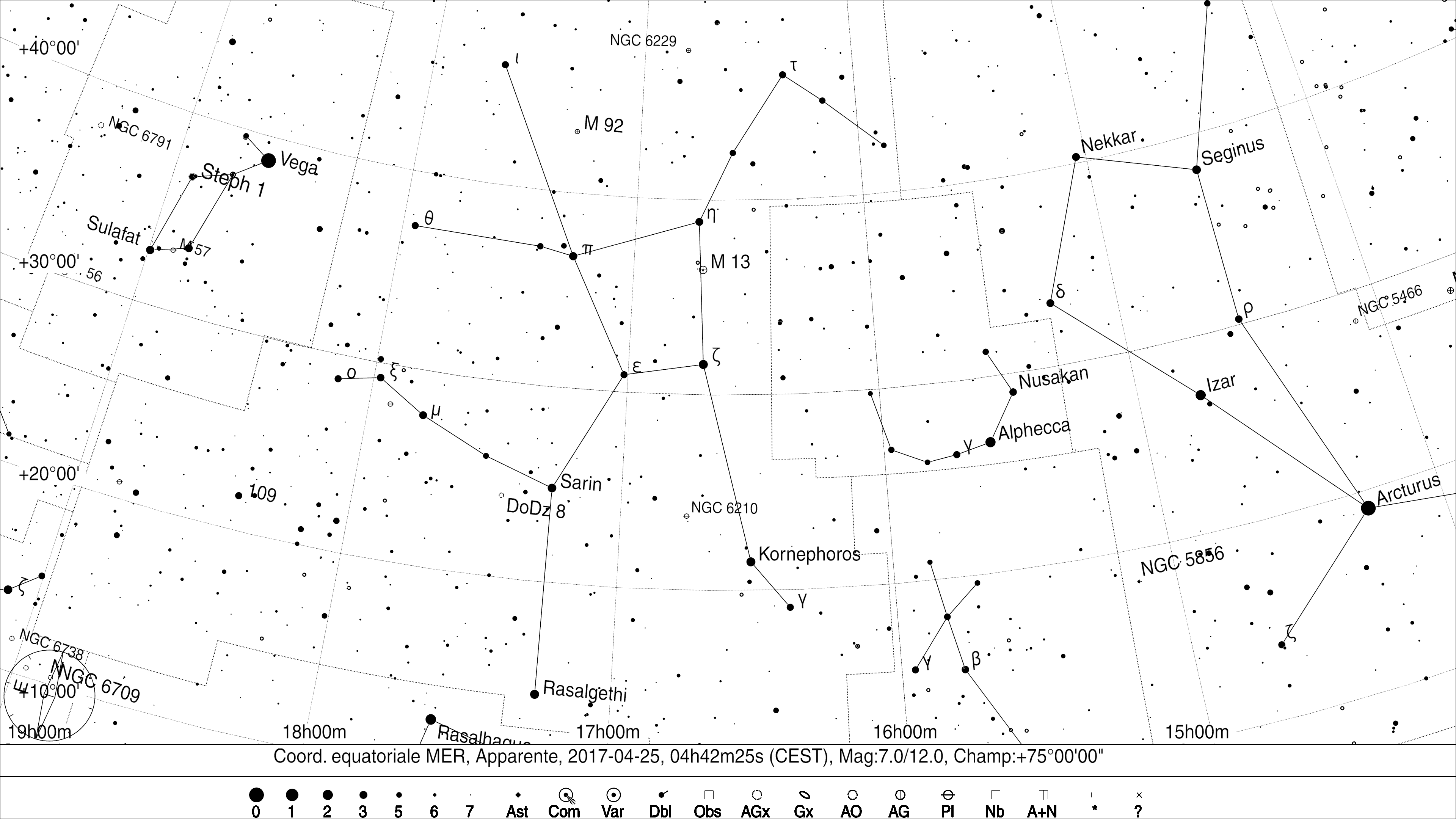 L’amas d’Hercule est facilement repérable, situé dans l’alignement des étoiles Dzeta et Eta Herculis à environ un tiers proche de cette dernière. Il est visible à l’œil nu dans d’excellentes conditions
