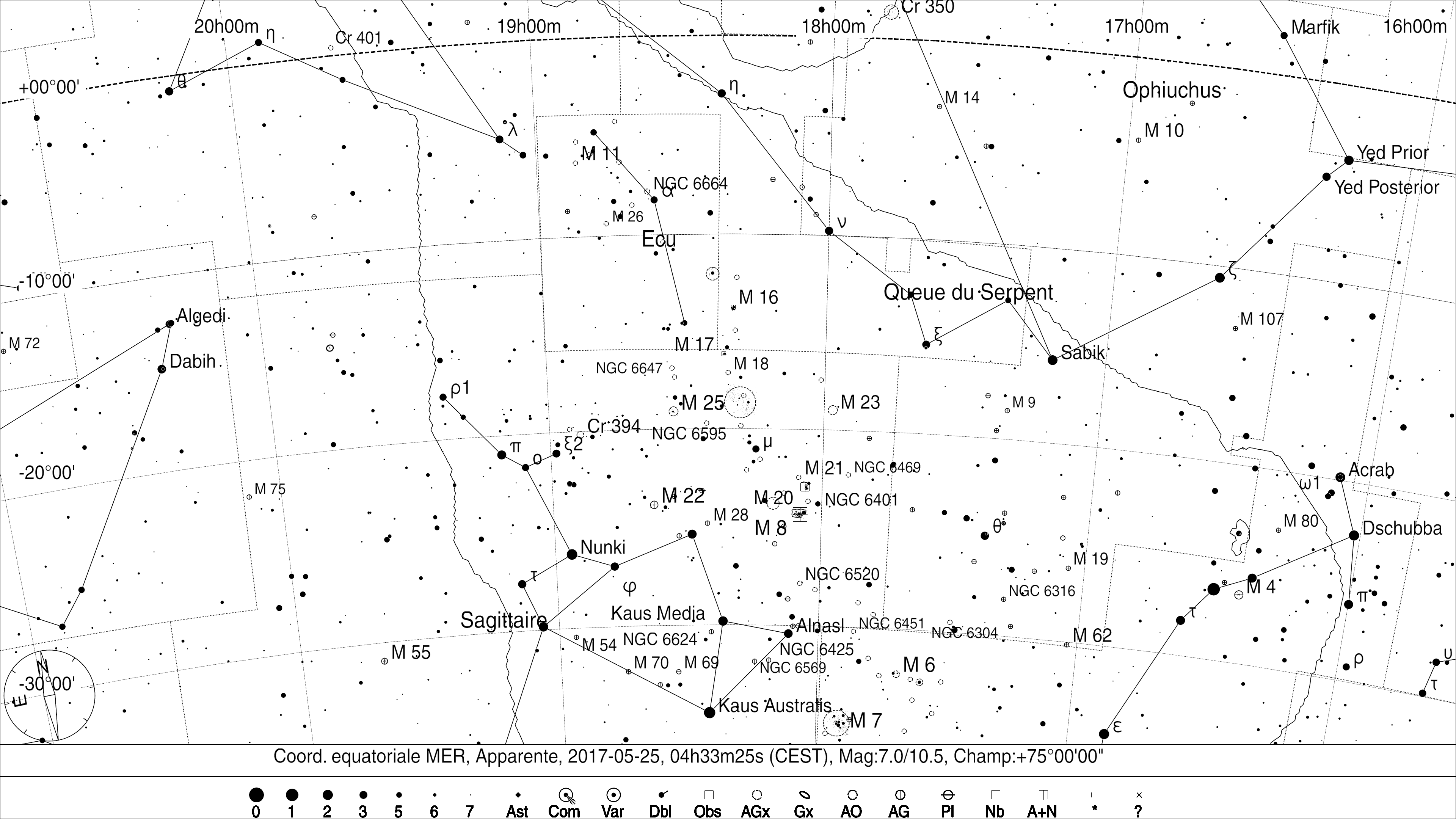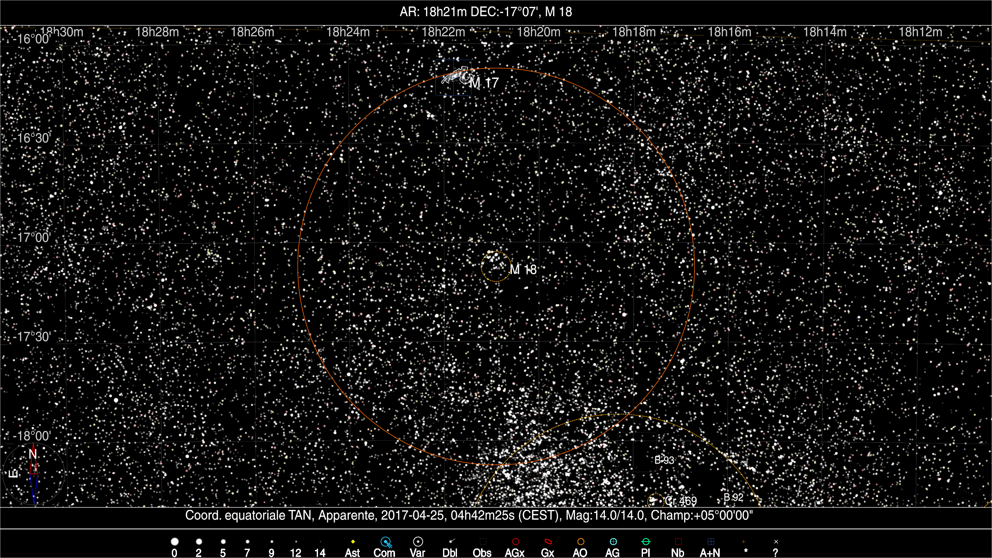 Bien que peu spectaculaire, M 18, coincé entre M 17 et M 24 est facilement repérable aux jumelles, à 1° S de M 17.