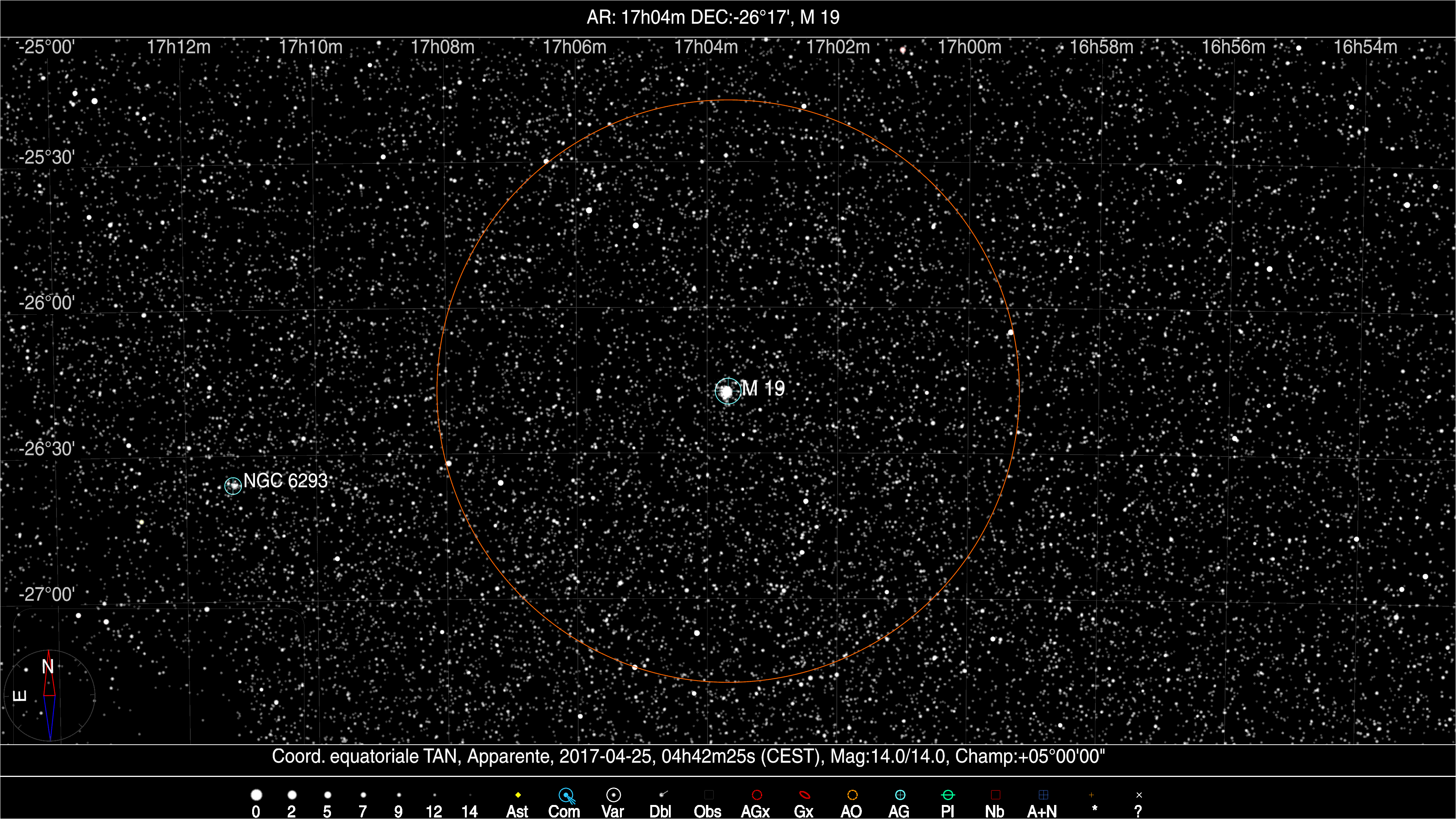 Messier 19 est relativement isolé. On peut le retrouver à plus de 7°E d’Antares. Facilement résolu en étoiles, on remarquera sa forme elliptique. Deux petits amas globulaires (NGC 6284 et 6293) se tiennent à proximité, dans un rayon de 1,5°.
