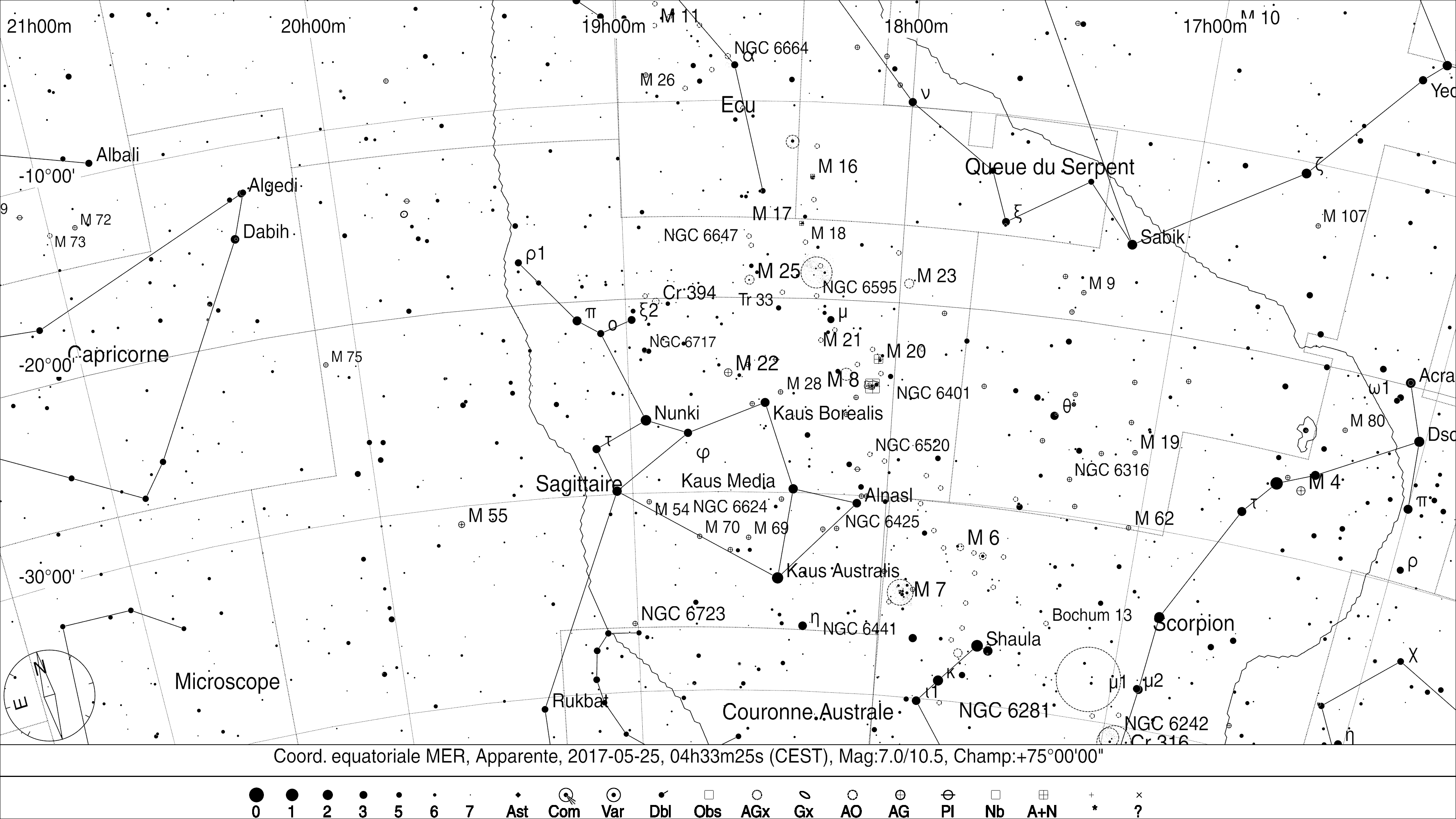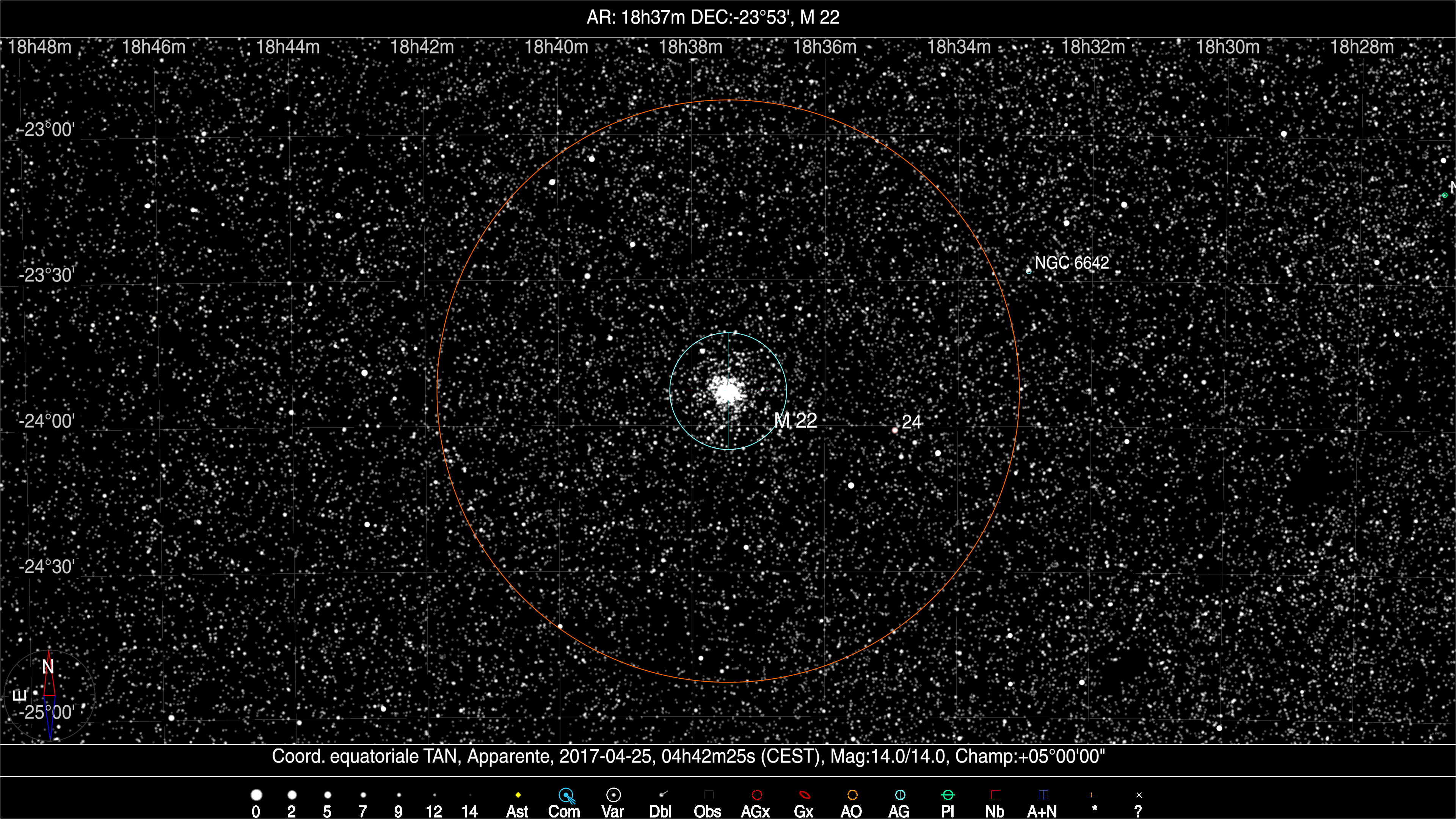 Visible à l’œil nu, Messier 22 est facile à repérer, à 2,4° NE de Lambda Sgr, appelée aussi Kaus Borealis, la pointe du chapeau de la théière, le surnom de la constellation du Sagittaire.