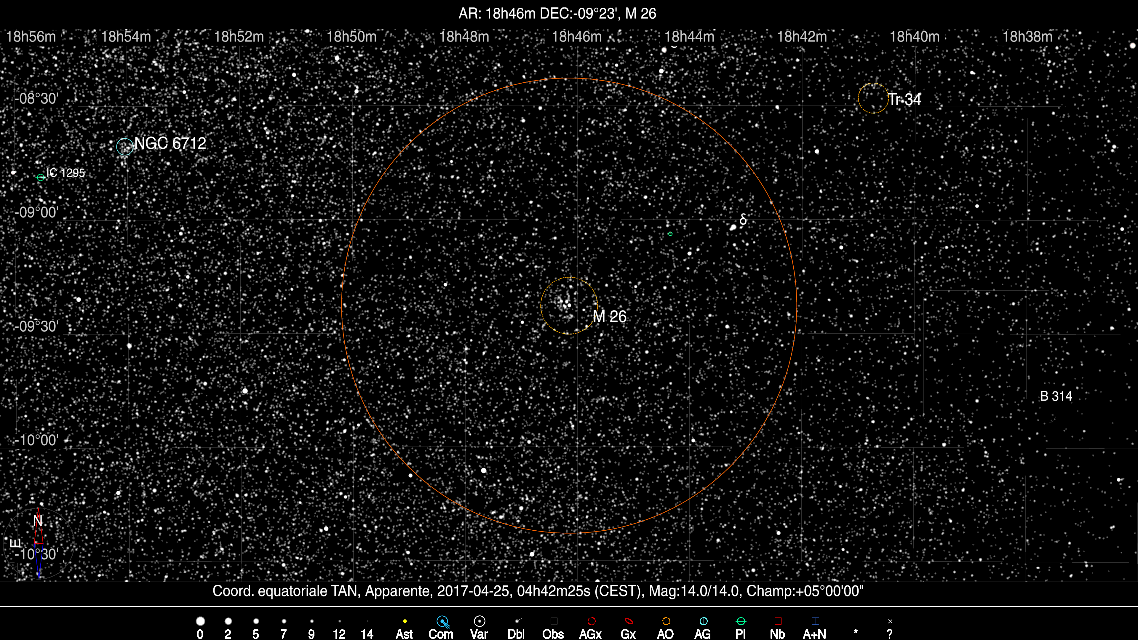 Situé à 48 minutes d’arc S-E de Delta de l’Ecu, Messier 26 ne devrait pas être trop difficile à repérer. Il faudra juste réussir à bien détacher l’amas du fond de ciel très dense en étoiles…