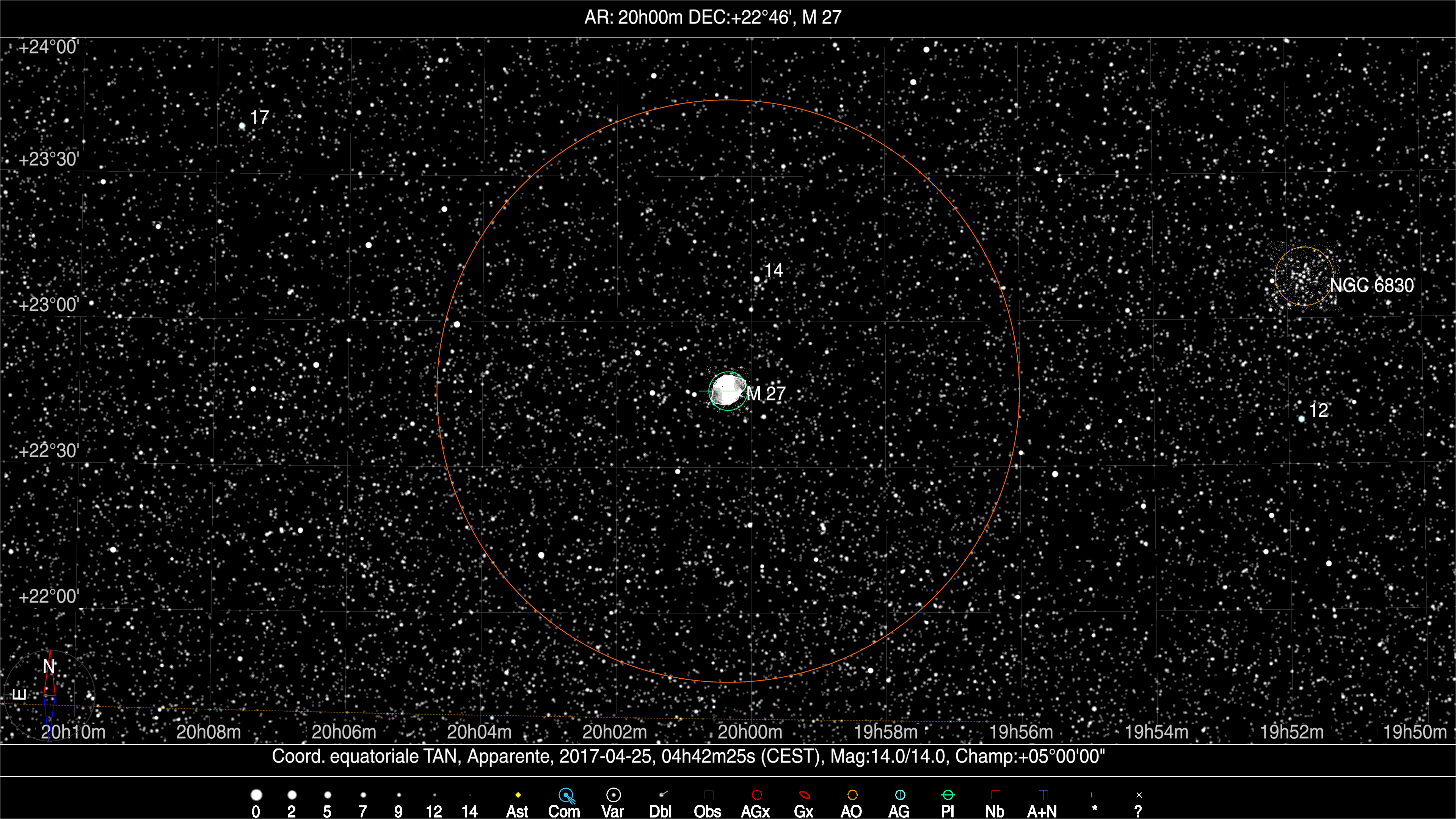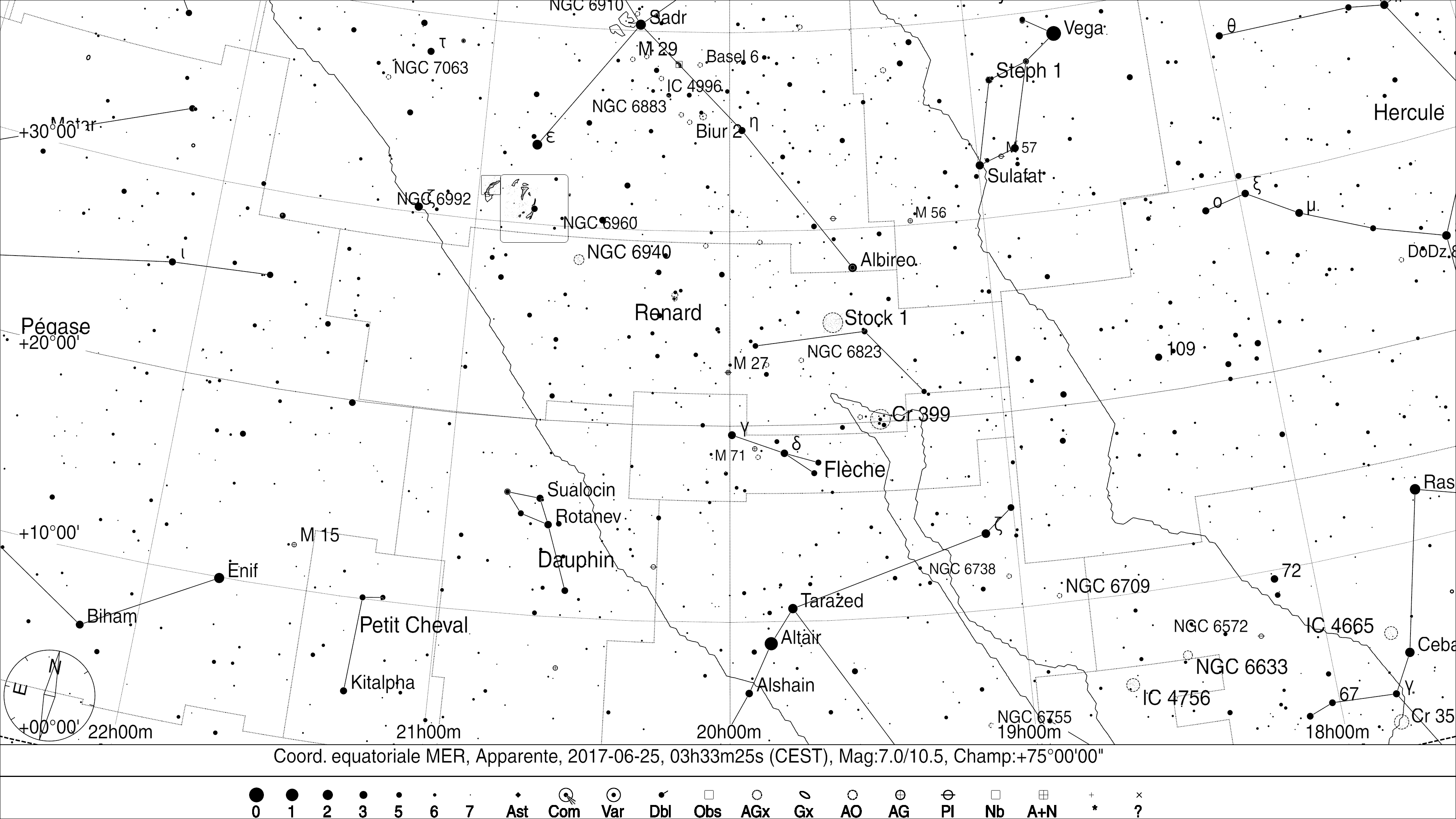 Pour retrouver facilement Messier 27, suivez la flèche ! Ou plus précisément, partez de la pointe de la constellation de la flèche (Gam Sge) et remontez de 3,3° vers le nord. Vous ne devriez pas la manquer…