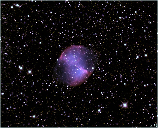 M 27 est une nébuleuse planétaire située dans la constellation du Petit Renard, vingt-septième entrée du catalogue de Messier qu’elle intégra en 1764. Charles Messier la découvrit le 12 juillet 1764, devenant ainsi la première nébuleuse planétaire inscrite à son catalogue (sur un total de 4). Sa nature de nébuleuse planétaire ne fut confirmée qu’en 1866 par l’astronome anglais William Huggins grâce à la spectroscopie. La nébuleuse a beaucoup excité l’imagination des astronomes qui lui ont attribué nombre de surnoms : Dumbbell, Haltère, Battant de cloche, Trognon de pomme, Sablier, Diabolo…