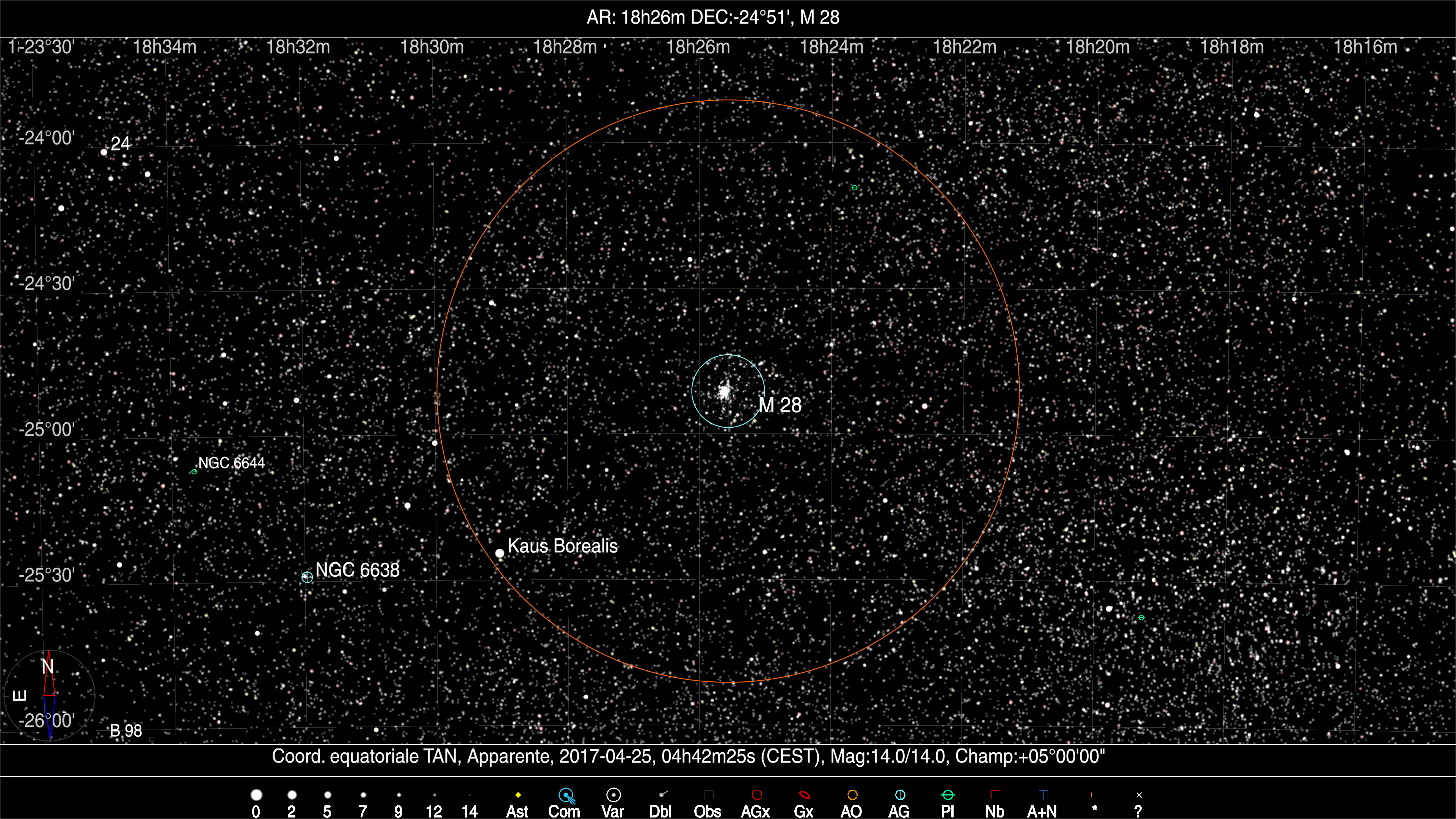 Situé à seulement 1° NO de Lambda Sgr (Kaus Borealis) Messier 28 sera aisément repérable aux jumelles. Il commencera à être résolu en étoiles avec un télescope de 150 mm de diamètre.