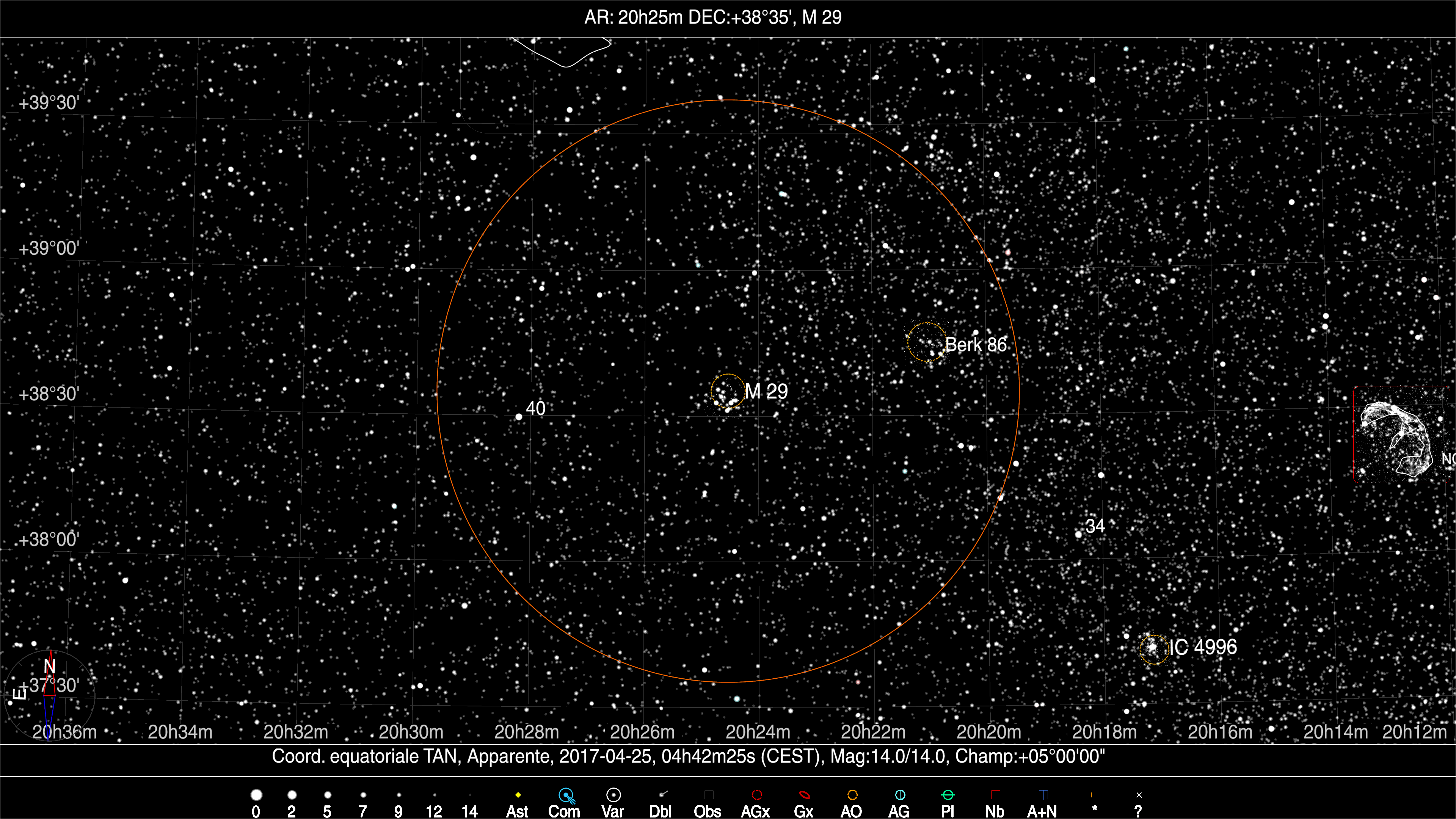 M 29 se trouvant dans une dense région de la Voie Lactée, le plus difficile sera de le distinguer du fond de ciel. Il faut le rechercher à proximité de gam. Cyg. connue sous le nom de Sadr, à 1°42 SSE de cette dernière