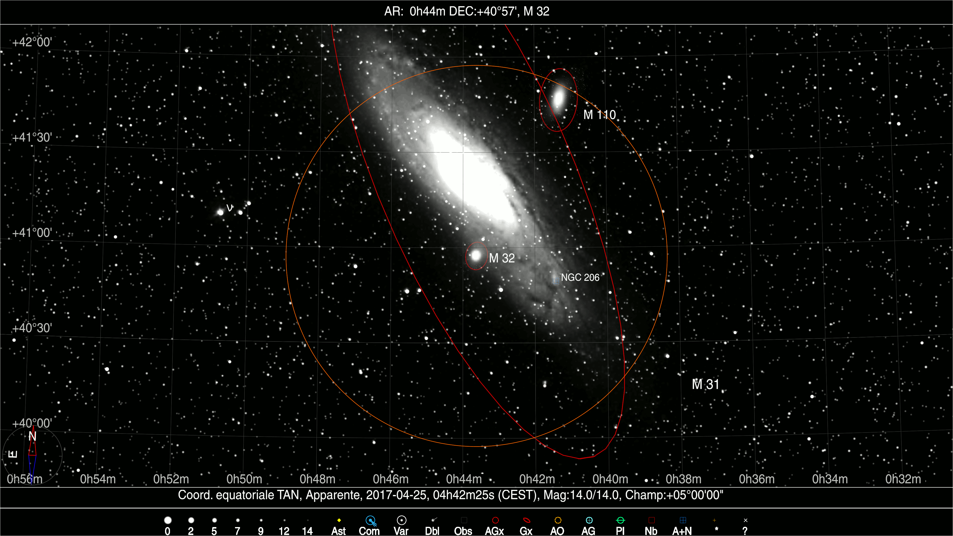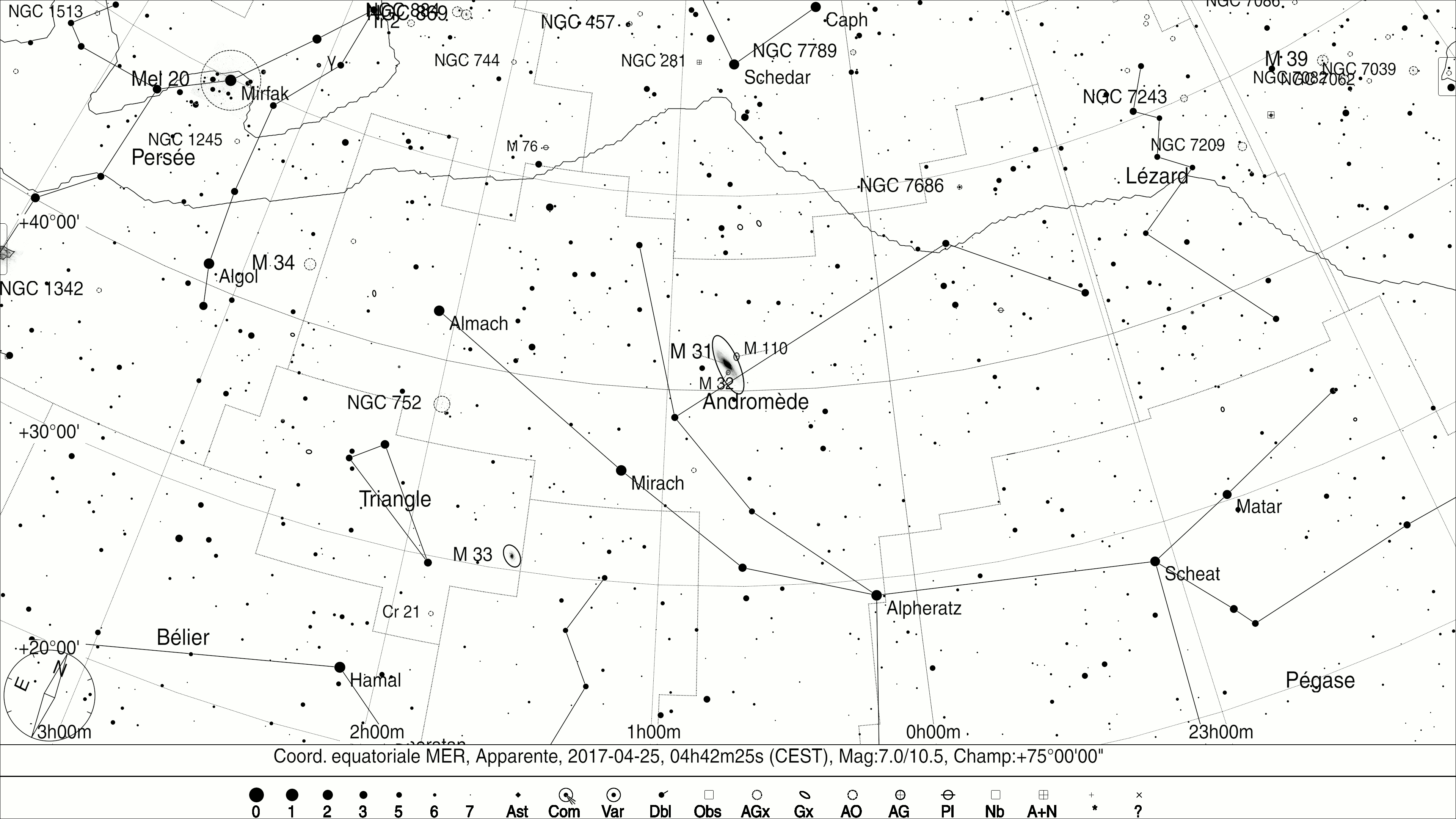 Il n’est pas difficile de retrouver Messier 32, il suffit de reprendre le chemin qui nous a aidé à trouver Messier 31 ! Le Gentil se trouve à seulement 21minutes d’arc au sud du noyau de la grande galaxie d’Andromède.