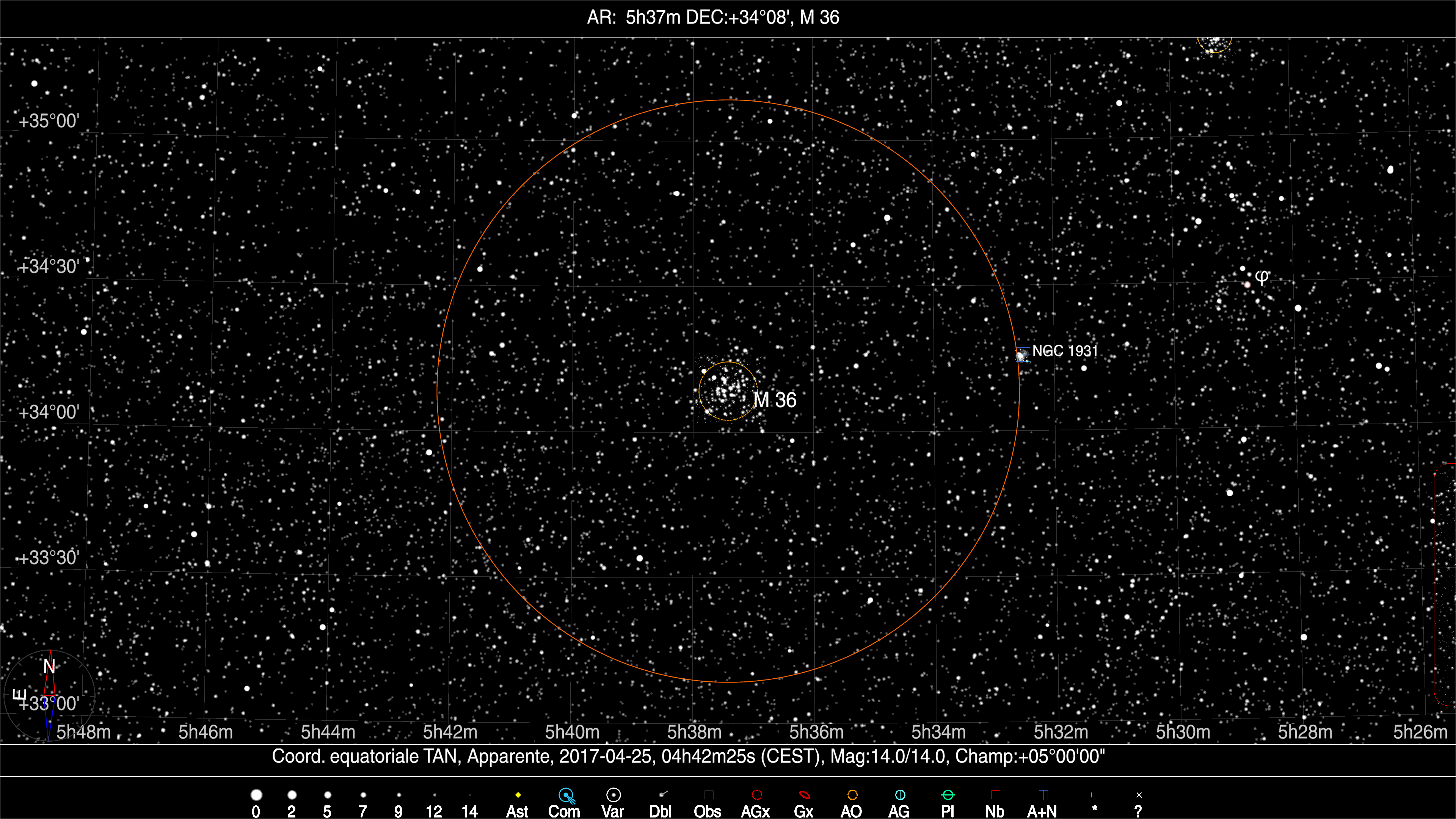 Repérer Messier 36 n’est pas bien difficile. On le trouve sur une ligne reliant Menkalinan et El Nath. Il se situe également à 1,7° de l’étoile Phi du Cocher. Il est aussi coincé entre les deux autres amas du Cocher, M 37 et M 38. Passer de l’un à l’autre aux jumelles est un régal pour les yeux.