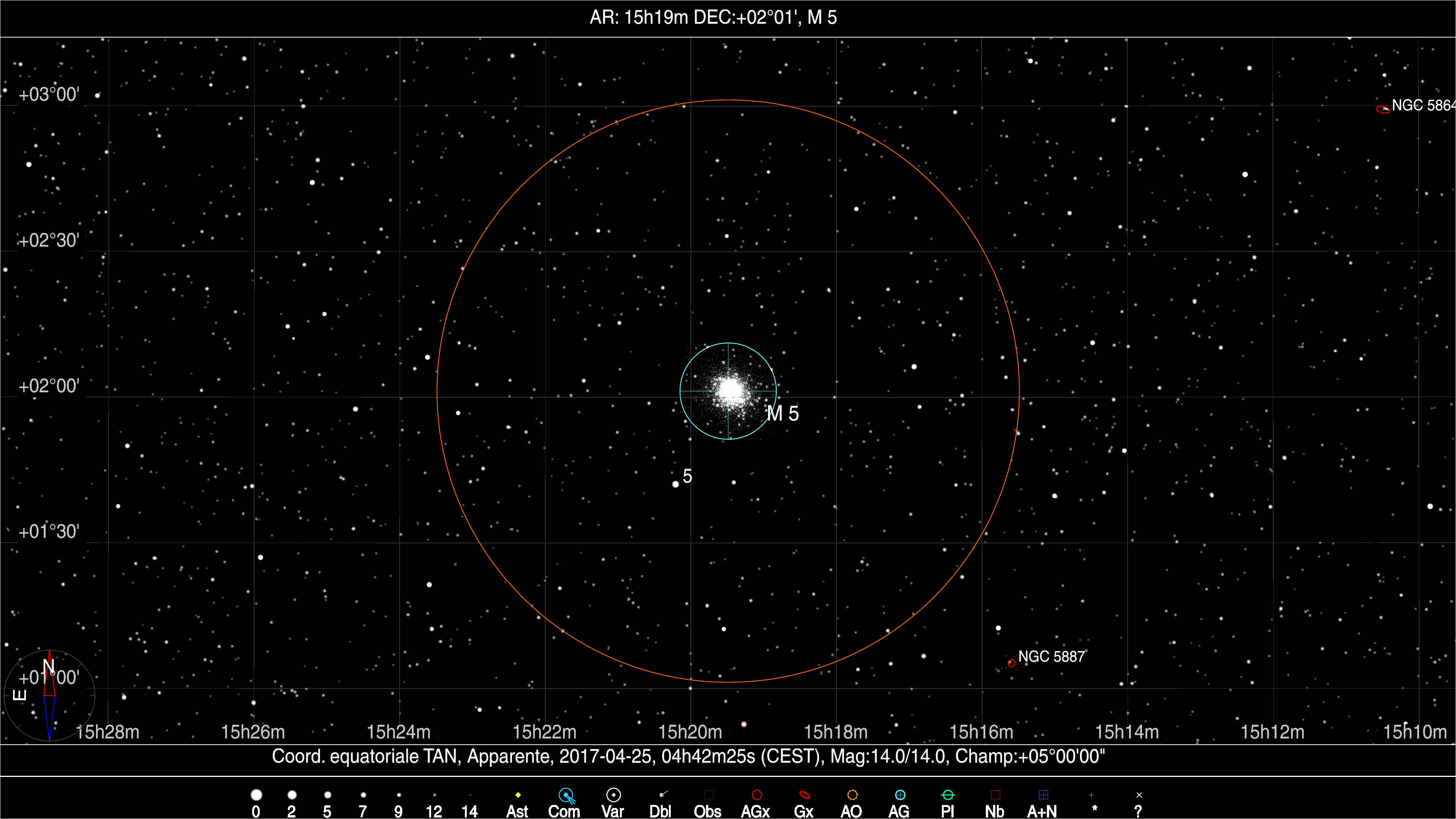Le meilleur moyen pour repérer Messier 5 est – dans un bon ciel – de s’appuyer sur un alignement d’étoile composé de 109 Vir (m +3,7), 110 Vir (m +4,3). L’étoile suivante n’est pas une étoile, c’est M5 visible à l’œil nu… Messier 5 se trouve à 20′ NO de 5 Ser (m +5,1)