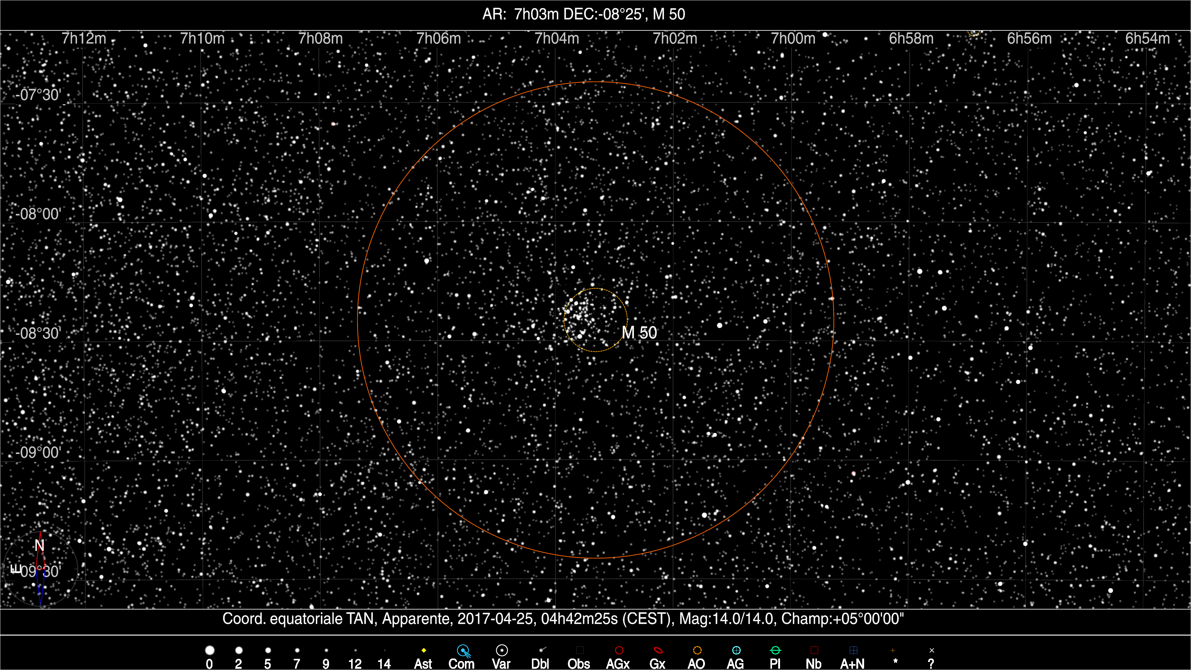 Perdu au beau milieu de la Voie Lactée, Messier 50 n’est pas si facile à observer malgré sa brillance. On pourra le trouver aux deux cinquièmes de la distance de Sirius à Procyon, légèrement sur la droite.