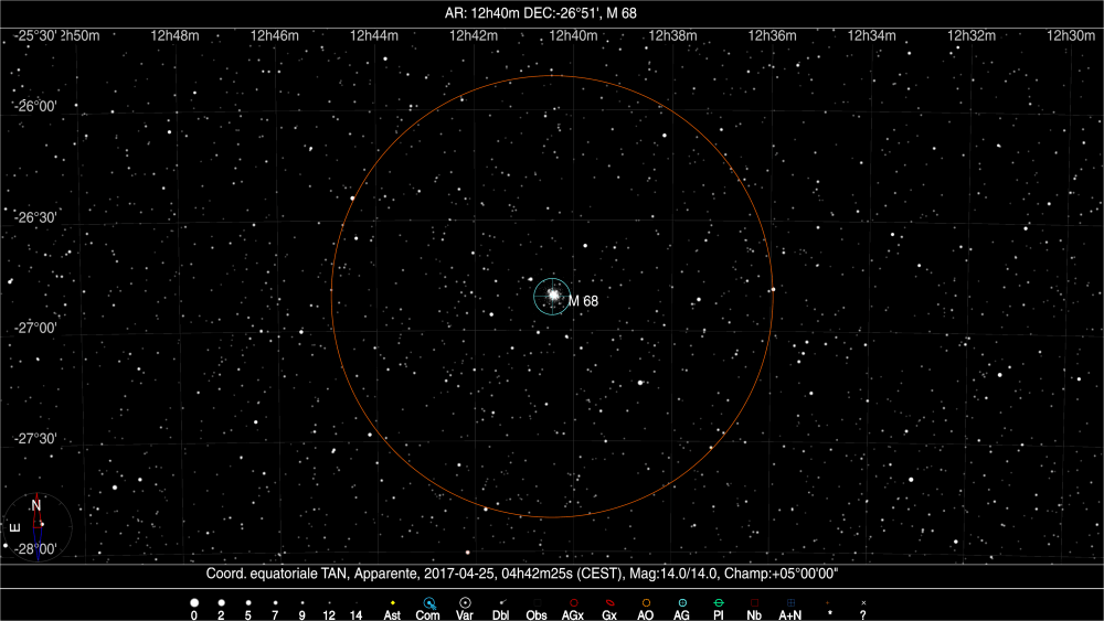 M 68 est un amas globulaire situé dans la constellation de l’Hydre Femelle, soixante-huitième entrée du catalogue Messier qu’il intégra en 1780. Il a été découvert par Charles Messier qui l’ajouta à son catalogue le 9 avril.