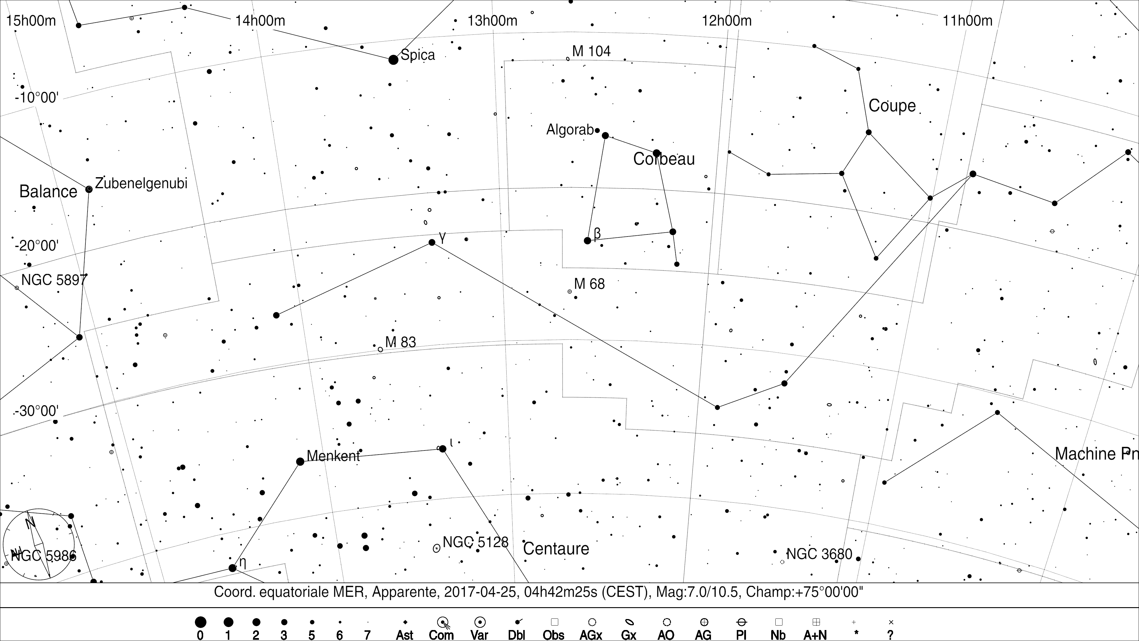 Bien que bas à l’horizon à nos latitudes, M 68 est facile à repérer et à observer. Il suffit de prolonger de moitié l’alignement Algorab – Beta du Corbeau et vous y êtes !