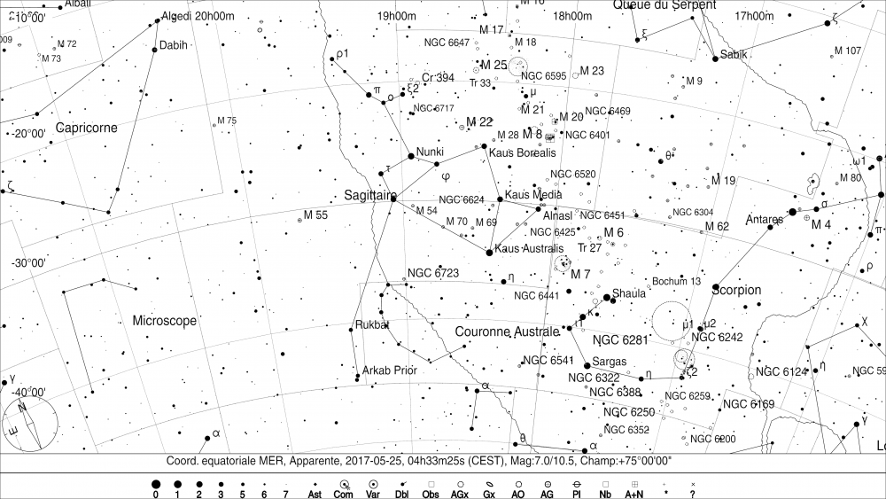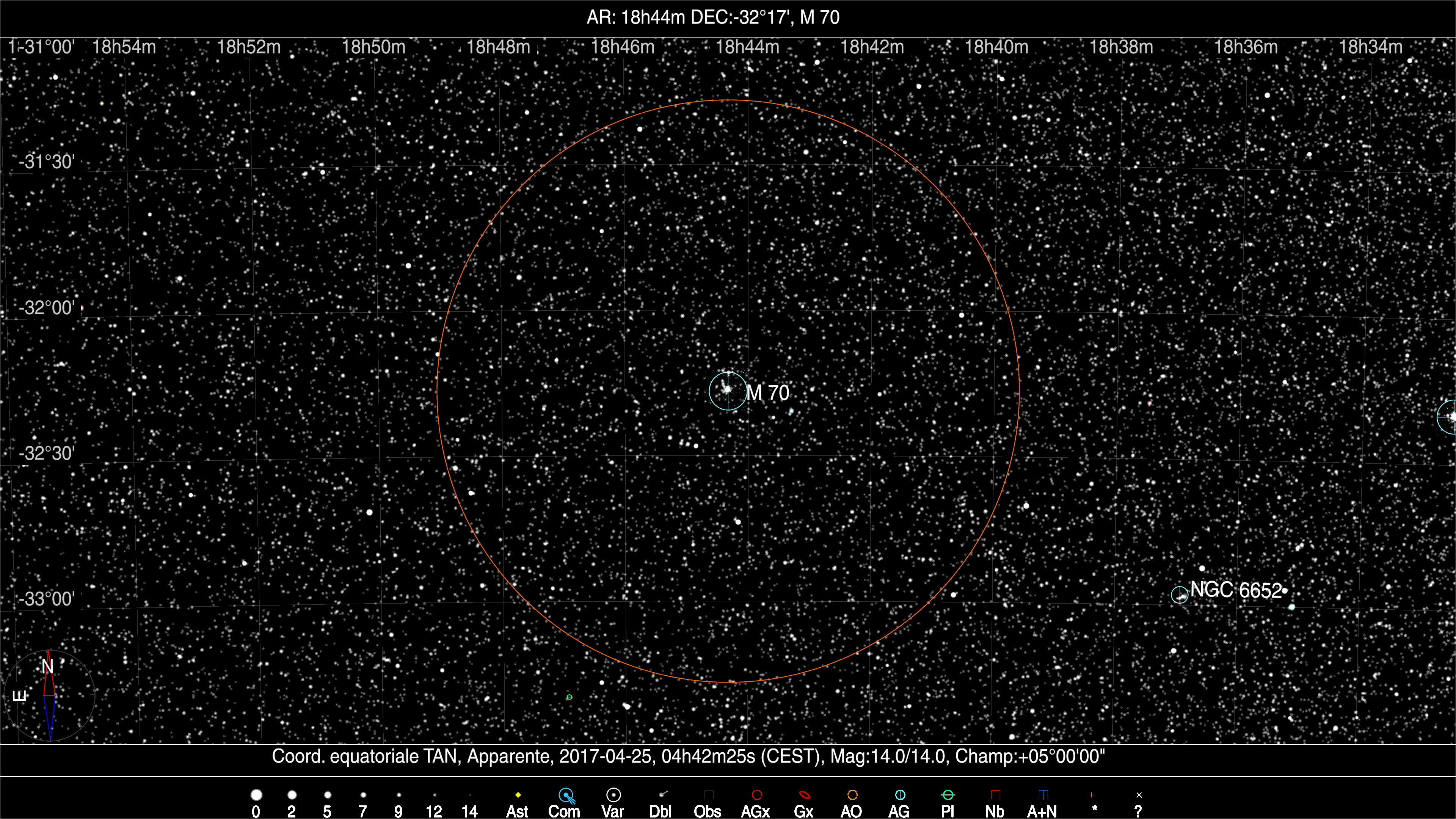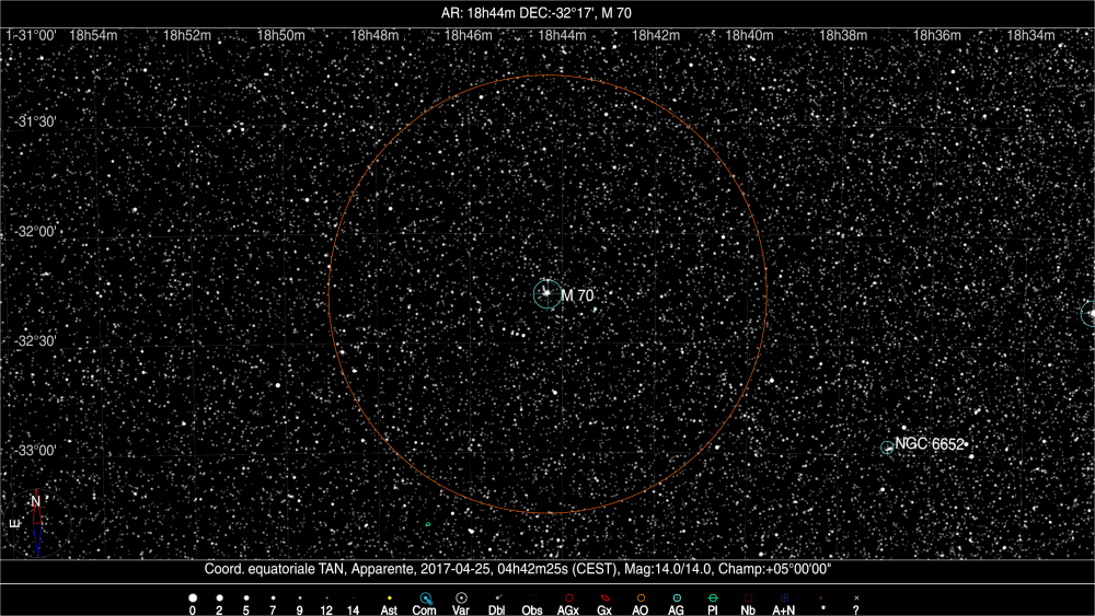 M70 est facile à repérer, exactement à mi-chemin des deux étoiles formant la base de la théière, Ascella et Kaus Australis. Cependant, du fait de sa faible hauteur à nos latitudes, elle ne sera pas très aisée à observer.