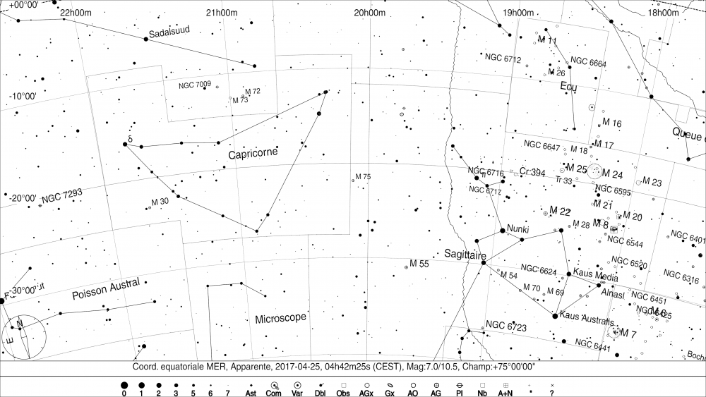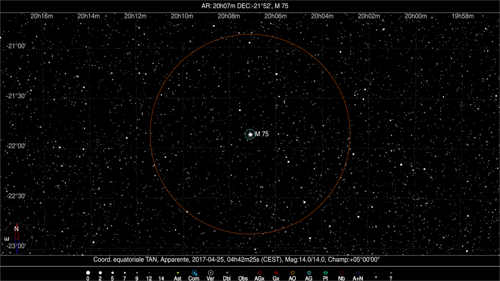 Repérer Messier 75 n’est pas simple. Outre sa taille modeste, il se situe dans une zone pauvre en étoiles remarquables. On peut toutefois signaler la présence de l’étoile 4 Capricornii à 2°46 minutes Est de l’amas.