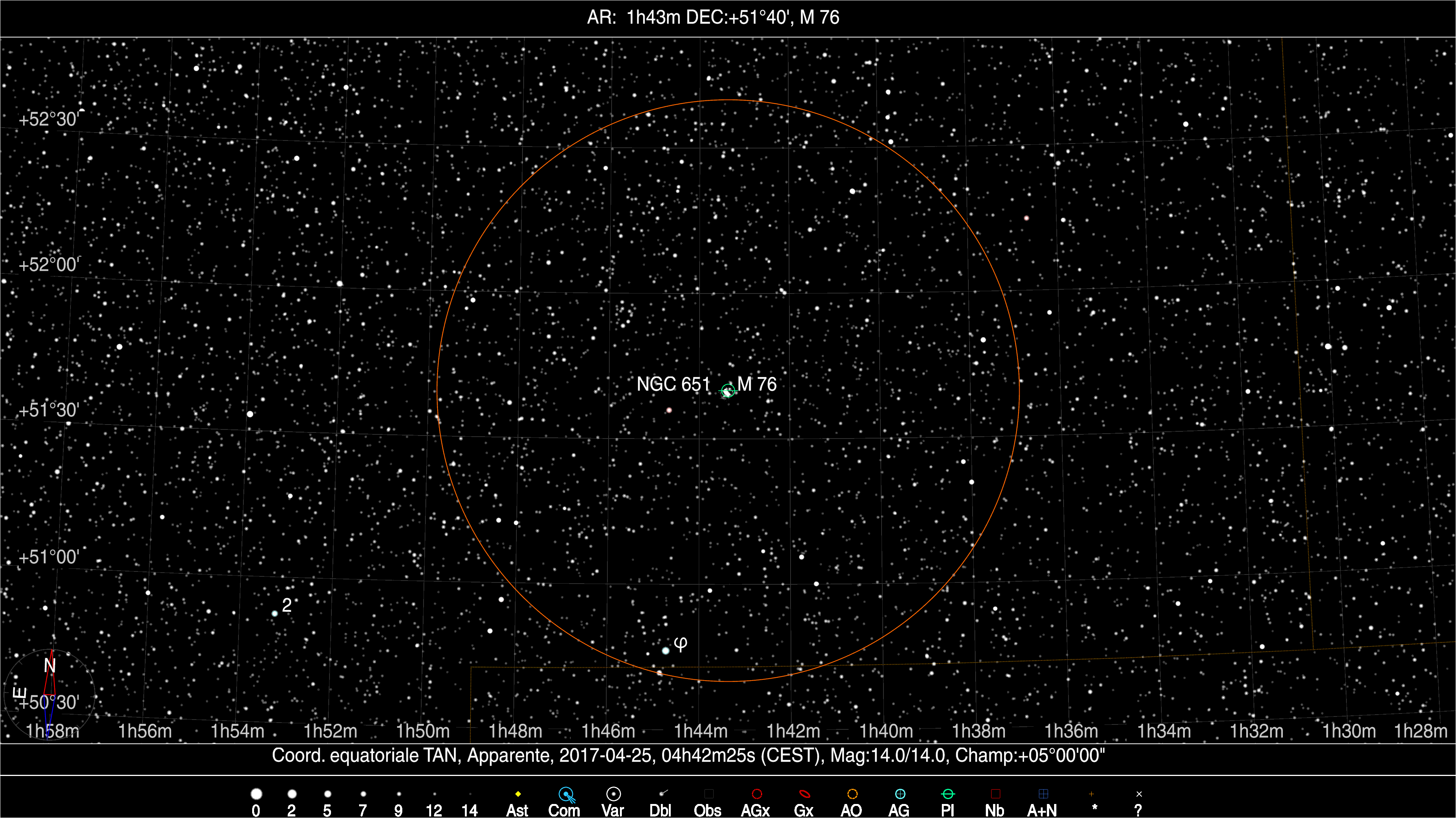 Du fait de sa taille et de sa nature subtilement nébuleuse, M 76 est l’un des Messier les plus compliqués à observer. Néanmoins il sera facile de la repérer à 55′ de l’étoile Phi Persei.