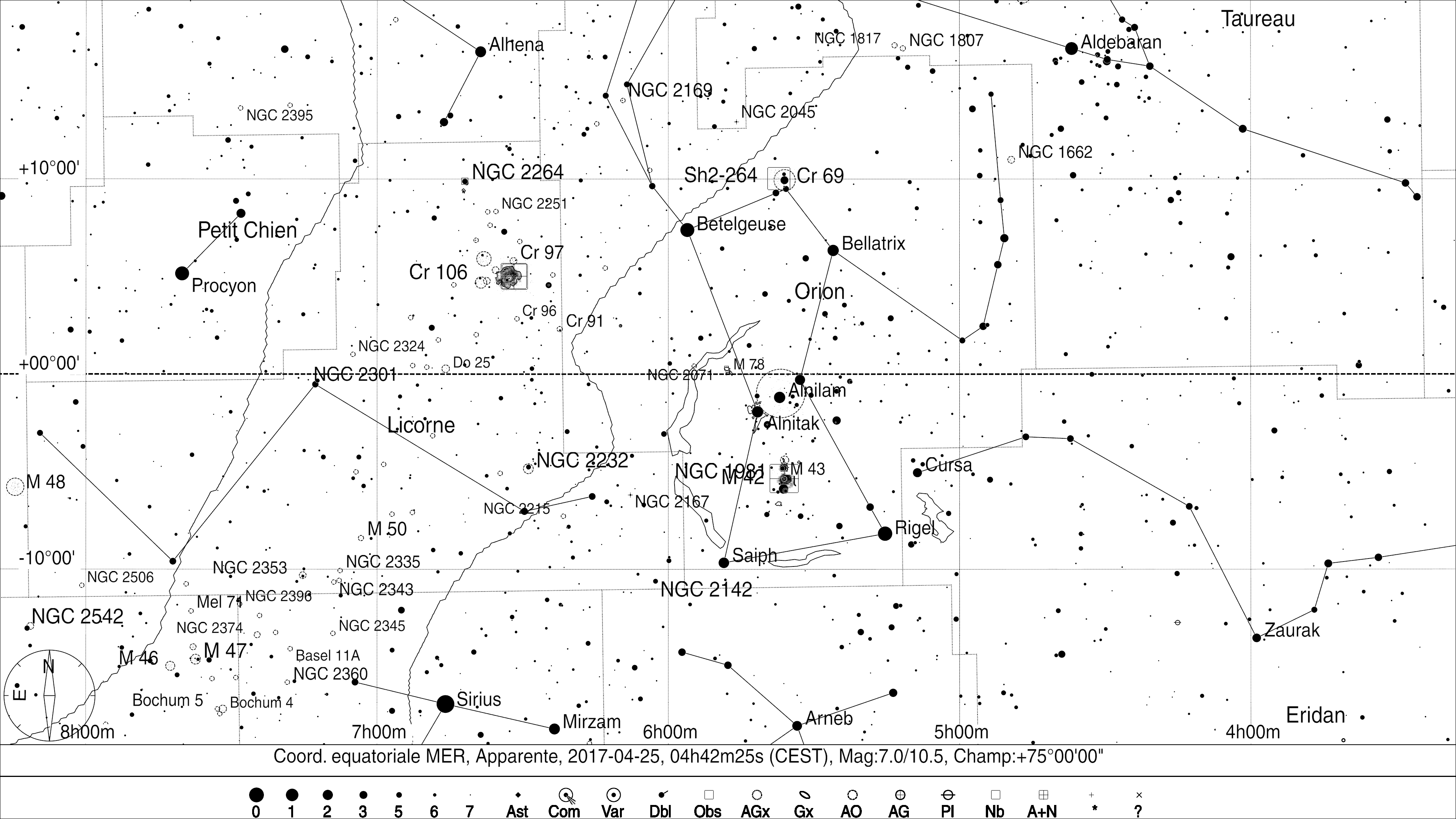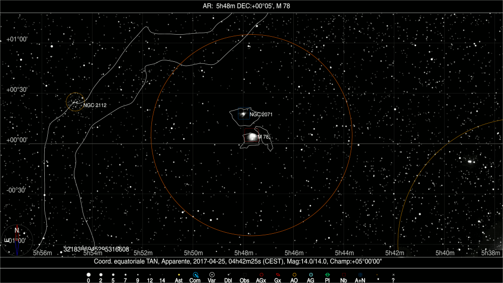 M 78 est à repérer à 2,5° au-dessus d’Alnitak. La nébuleuse n’est pas facile à observer pour les petits instruments. Il faudra en outre privilégier un ciel bien stable, sombre, dénué de lumières parasites.