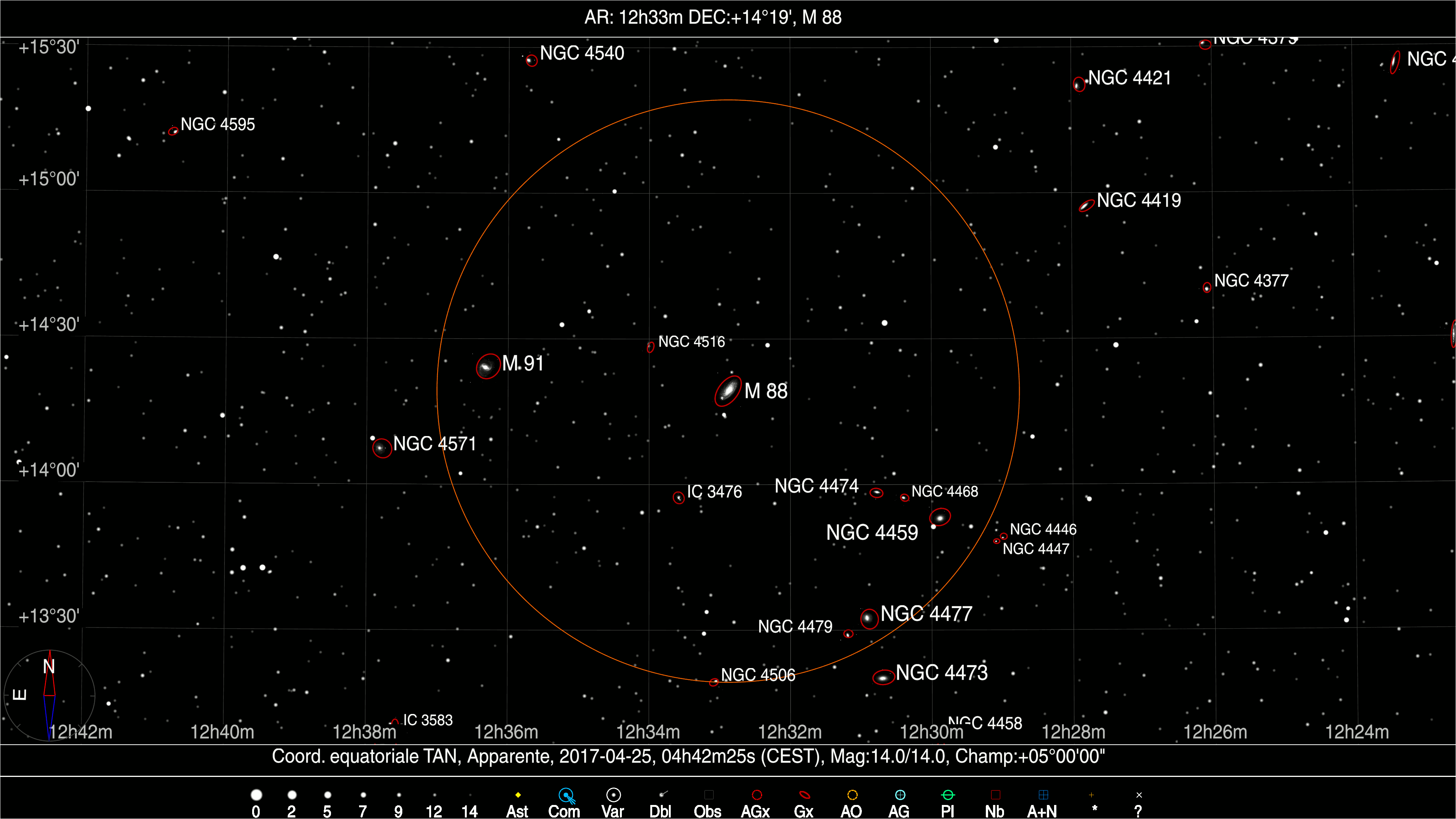 Un peu isolée, on peut repérer M 88 dans le prolongement de la chaine de Markarian (M 84, 86, etc.). Très esthétique, son inclinaison la fait ressembler à une galaxie d’Andromède miniature.