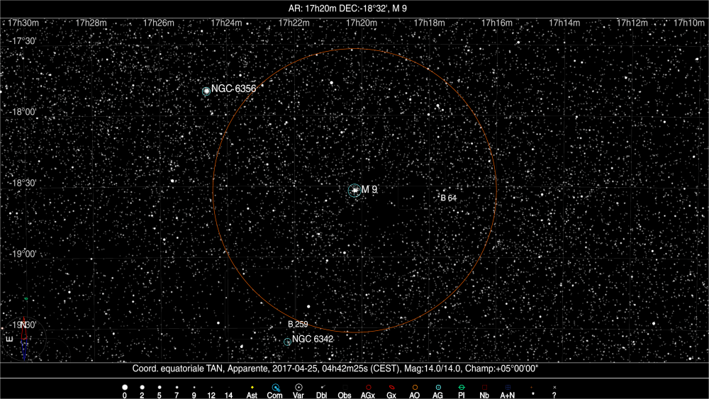 Messier 9 fait partie des objets Messier les moins brillants du catalogue. On pourra toutefois s’aider de la présence d’Eta Ophiuchi (Sabik) 3° au nord-ouest, et de Ksi Ophiuchi à 2,3 °au sud de l’amas globulaire.