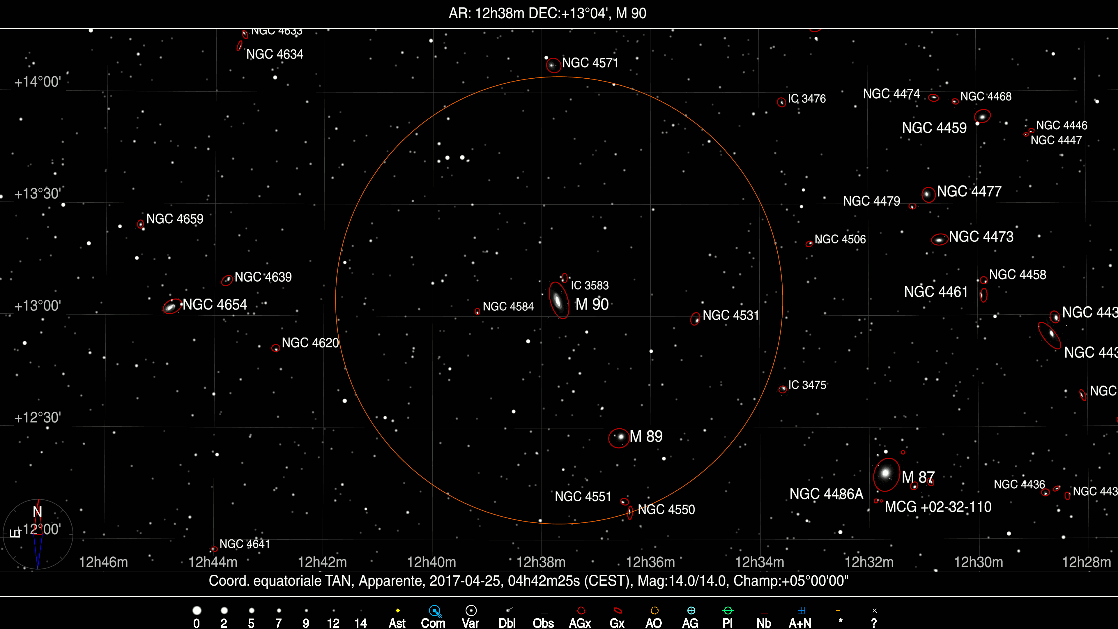 Si observer M 90 ne pose pas de problème, l’identifier parmi toutes ses voisines est plus délicat… Autant commencer par toutes les identifier (du moins les plus brillantes) en vous aidant de repères faciles : Vindemiatrix, Rho de la Vierge, la Chaîne de Markarian, M 87. Au-dessus de Rho, vous trouverez M 60, M 59 et 58, en remontant, M 89 et un peu plus haut encore M 90…