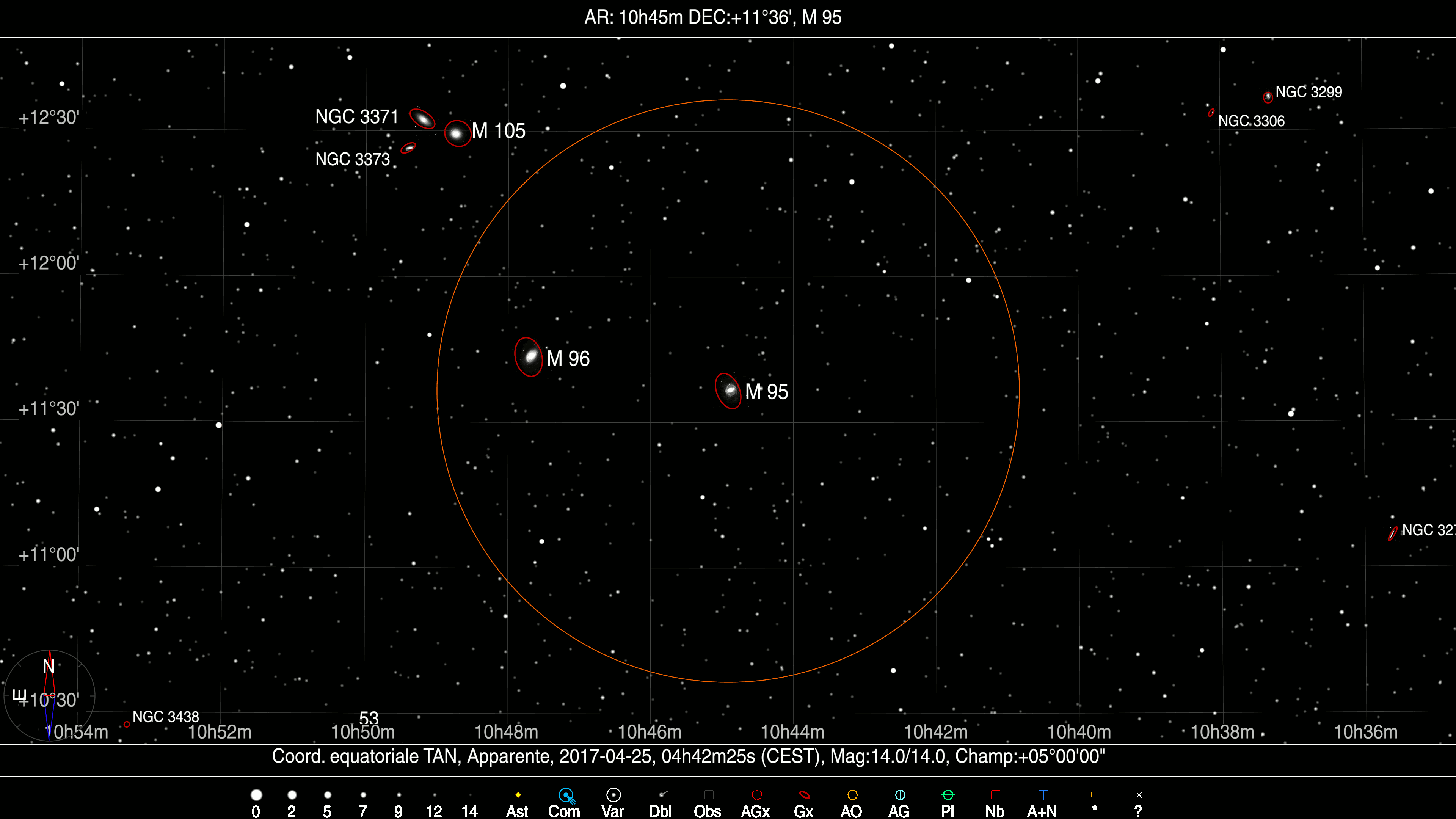 Selon les sources, Messier 95 serait à 32 ou 38 millions d’années lumière de nous environ, ses dimensions apparentes de 3,1 x 2,9 ou 7,3 x 4,4 minutes d’arc. Son diamètre est estimé à 46000 ou 80000 a.l. À prendre avec précaution, donc… M 95 fait partie d’un groupe de galaxies (Leo I) dominé par M 96 et qui comprend aussi M 105 et une vingtaine de galaxies d’éclat plus faible.