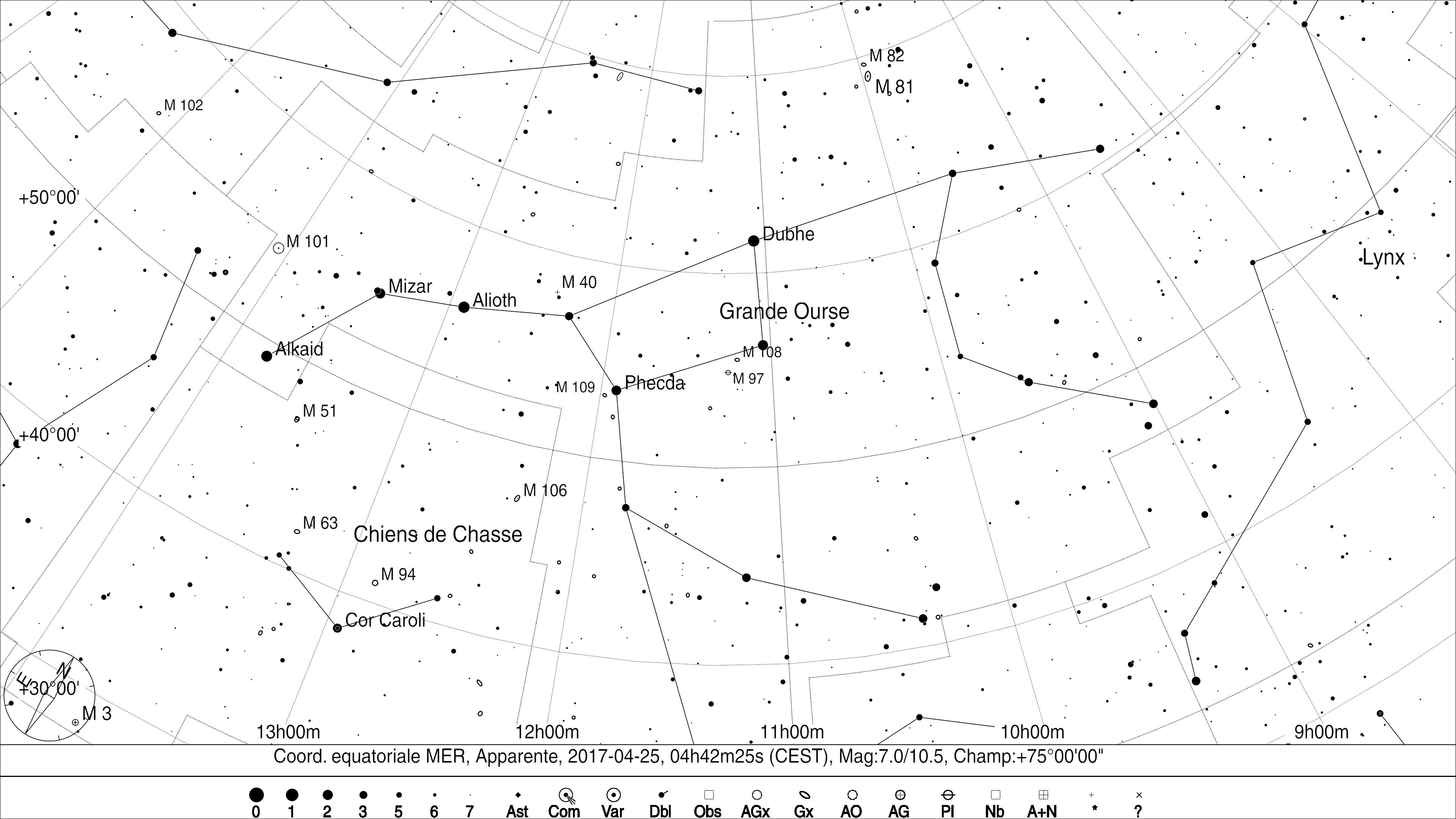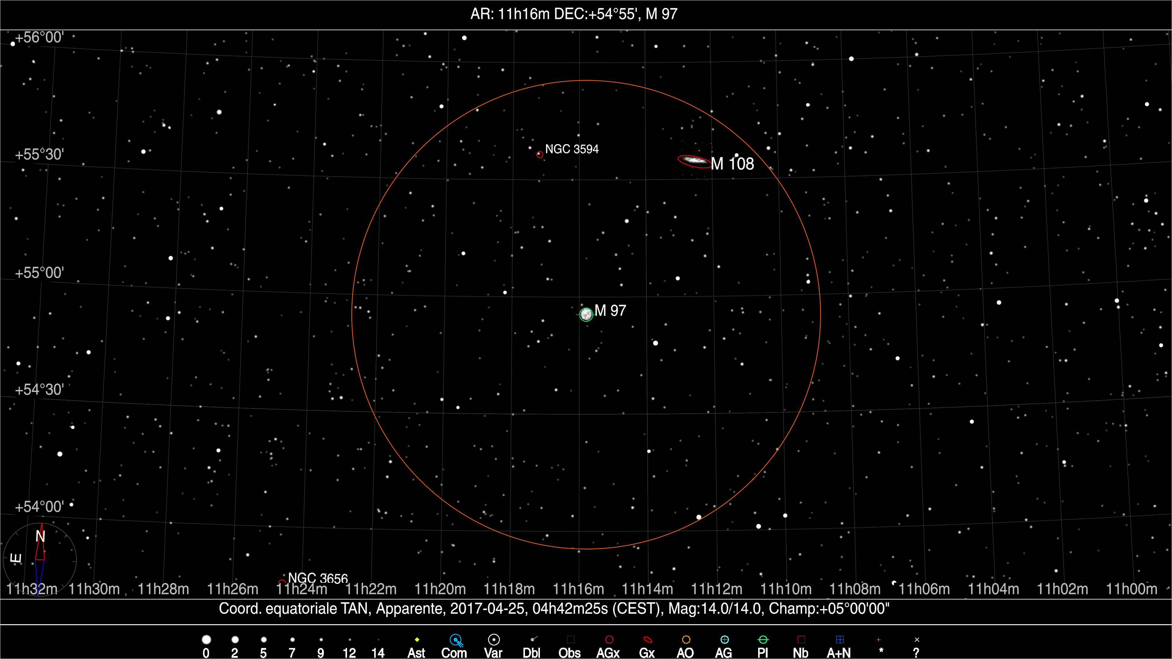 Facile à repérer, moins à observer, M 97 est à rechercher à un peu plus de deux degrés de Merak . Si vous partez de Merak, pensez à vous arrêter sur M 108, jolie galaxie à mi-chemin entre Merak et M 97. Des filtres Oxygène III ou UHC pourraient vous être utiles afin de faciliter son observation.