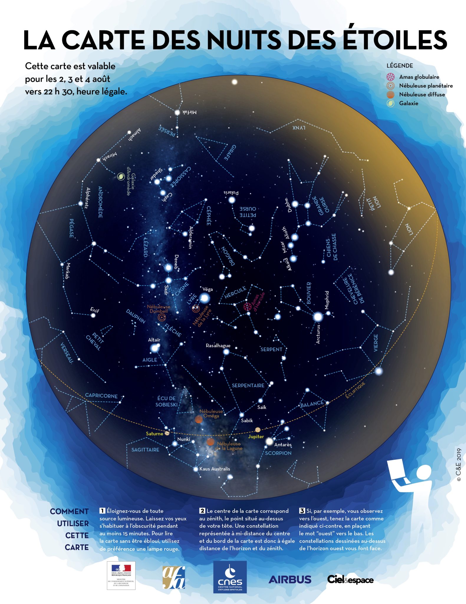 La carte du ciel pour la Nuit des Étoiles 2019 (à télécharger) :