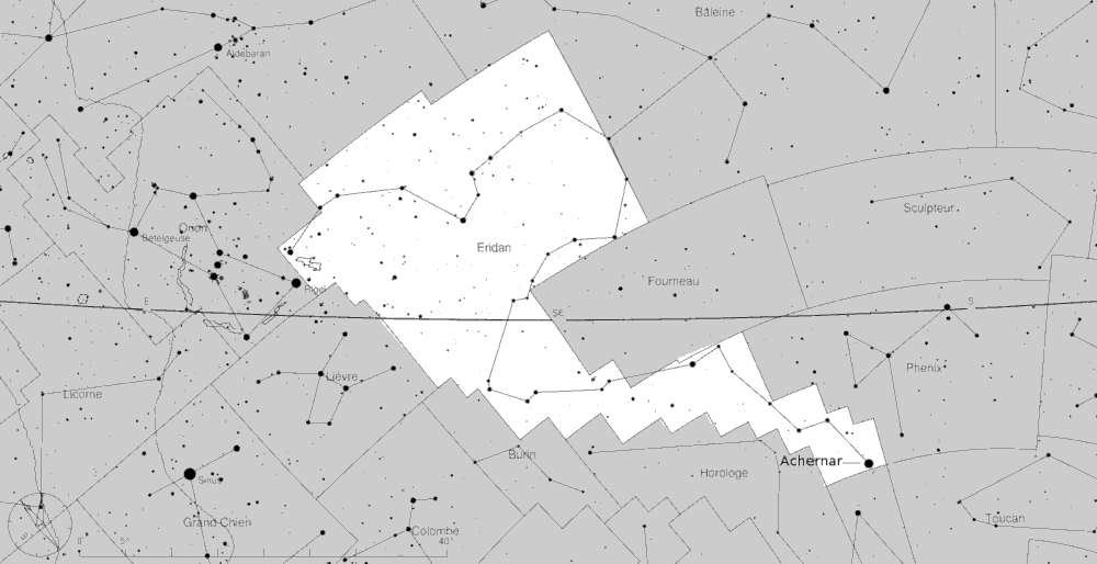 Infos : Alpha Eridani est la plus brillante étoile de la constellation de l’Eridan. Il s’agit d’une étoile double très serrée (détectée uniquement par le VLT). L’étoile principale est une naine ou sous-géante blanche de type spectral B3Vpe, 5000 fois plus lumineuse que le Soleil (en comptant l’ultra-violet), au moins six fois plus massive. Aplatie sur ses pôles, son diamètre est 7,7 à 12 fois plus grand. Nous ne savons pas grand chose de son compagnon, sinon que c’est une naine de type spectral A, assez similaire à Sirius, très proche visuellement, (moins de 0,5 arcsec) et 30 fois plus faible en luminosité que son voisin.
