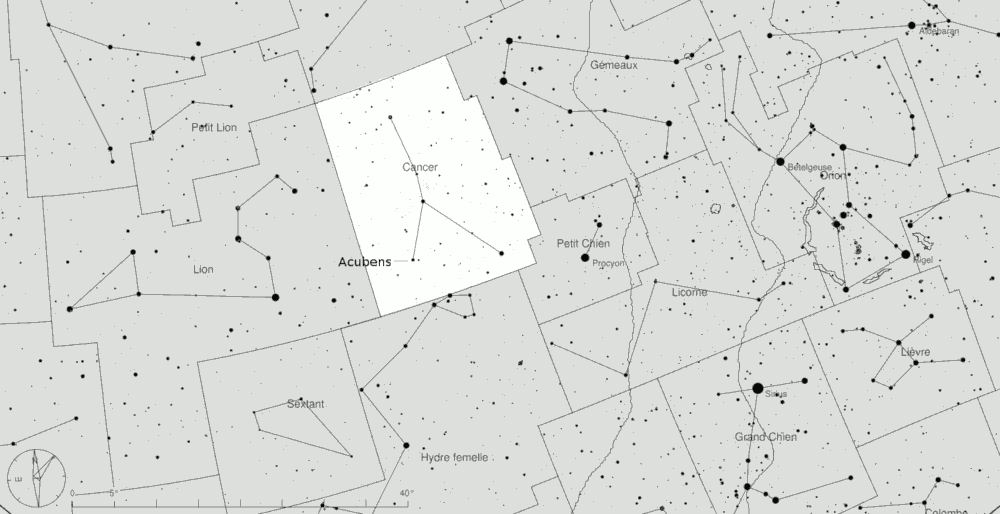 Infos : Acubens (Alpha Cancri / α Cnc) est une étoile située dans la constellation du Cancer. Le nom Acubens est dérivé de l’arabe Az-Zubana signifiant « la pince », en l’occurrence la pince du crabe. L’origine de ce nom est d’ailleurs la même que celle de Zuben Elgenubi, la pince du Scorpion. On la connait également sous le nom de Sertan, dérivé de sartan, crabe en hébreu.