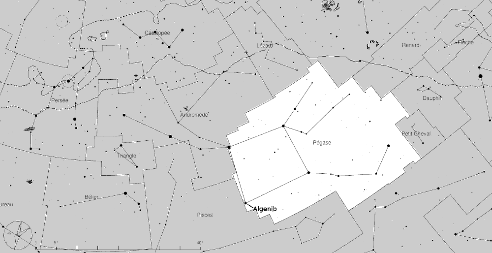 Infos : Gamma Pegasi est une étoile de la constellation de Pégase, située dans l’angle inférieur gauche de l’astérisme connu sous le nom de « grand carré de Pégase ». De magnitude apparente +2,83 en moyenne, oscillant entre +2,78 et 2+2,89, cette étoile variable bleue de type Beta Cephei est aussi très chaude : 21500 K, 4000 fois plus lumineuse que le soleil pour un rayon 4,5 fois supérieur et une masse estimée entre 7 et 10 masses solaires. L’étoile aurait un ou plusieurs compagnons très proches dont on ne sait pas grand chose.