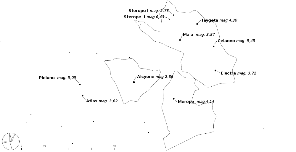L’origine du nom « Pléiades » provient de la mythologie grecque : les Pléiades sont sept sœurs, filles d’Atlas et de Pléioné : Astérope, Mérope (ou Dryope, ou Aéro), Électre, Maïa, Taygète, Célaéno (ou Sélène) et Alcyone.