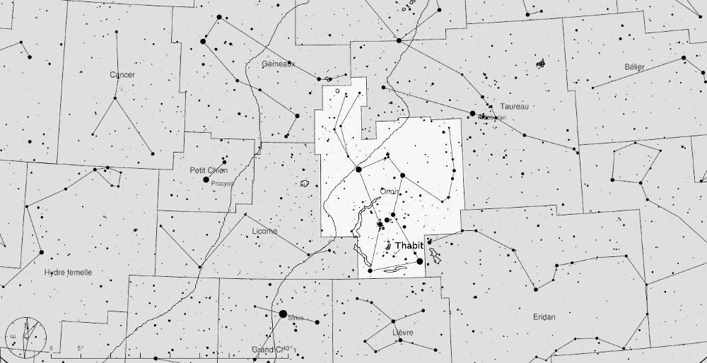 Infos : Upsilon Orionis (υ Ori, υ Orionis) est une étoile de la constellation d’Orion. C’est une étoile variable de type Beta Cephei, de couleur bleu-blanc avec une période de 12 heures. Étoile chaude (environ 32000K), elle éclaire 173000 fois plus que le Soleil. Mais sa distance (près de 3000 années lumière) ne nous permet pas d’avoir des mesures suffisamment précises et fiables avec la méthode du calcul de la parallaxe utilisée par Hipparcos.