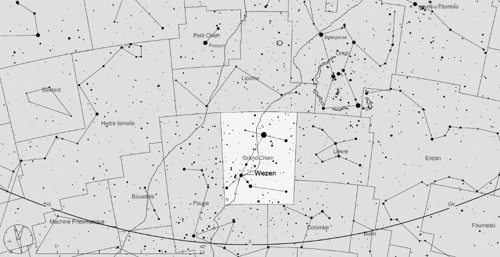 Infos :Delta Canis Majoris (δ CMa / δ Canis Majoris) est une supergéante jaune-blanche avec une magnitude apparente de +1,84. Elle est ainsi la troisième étoile la plus brillante de la constellation du Grand Chien. Sa température est de 6200°K, soit à peine plus que le Soleil, alors que son rayon atteint 195 fois celui de notre étoile (pratiquement l’orbite de la Terre). Avec une vitesse de rotation de 28 km/s, Wezen met une année à tourner sur elle même.
